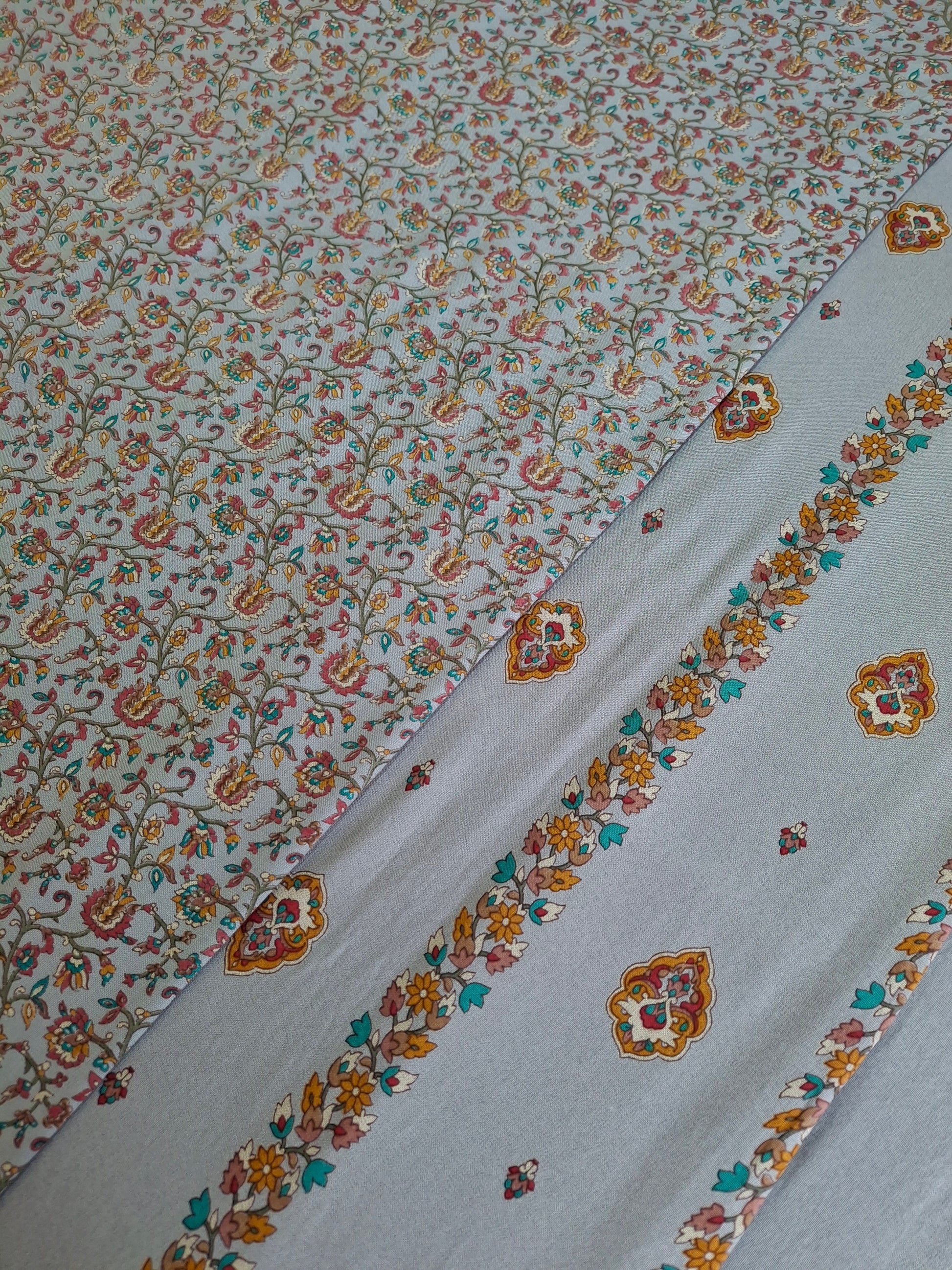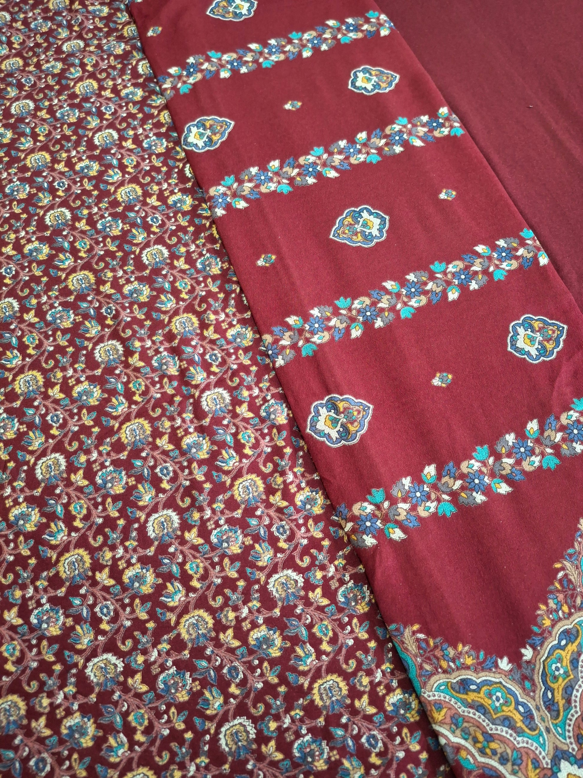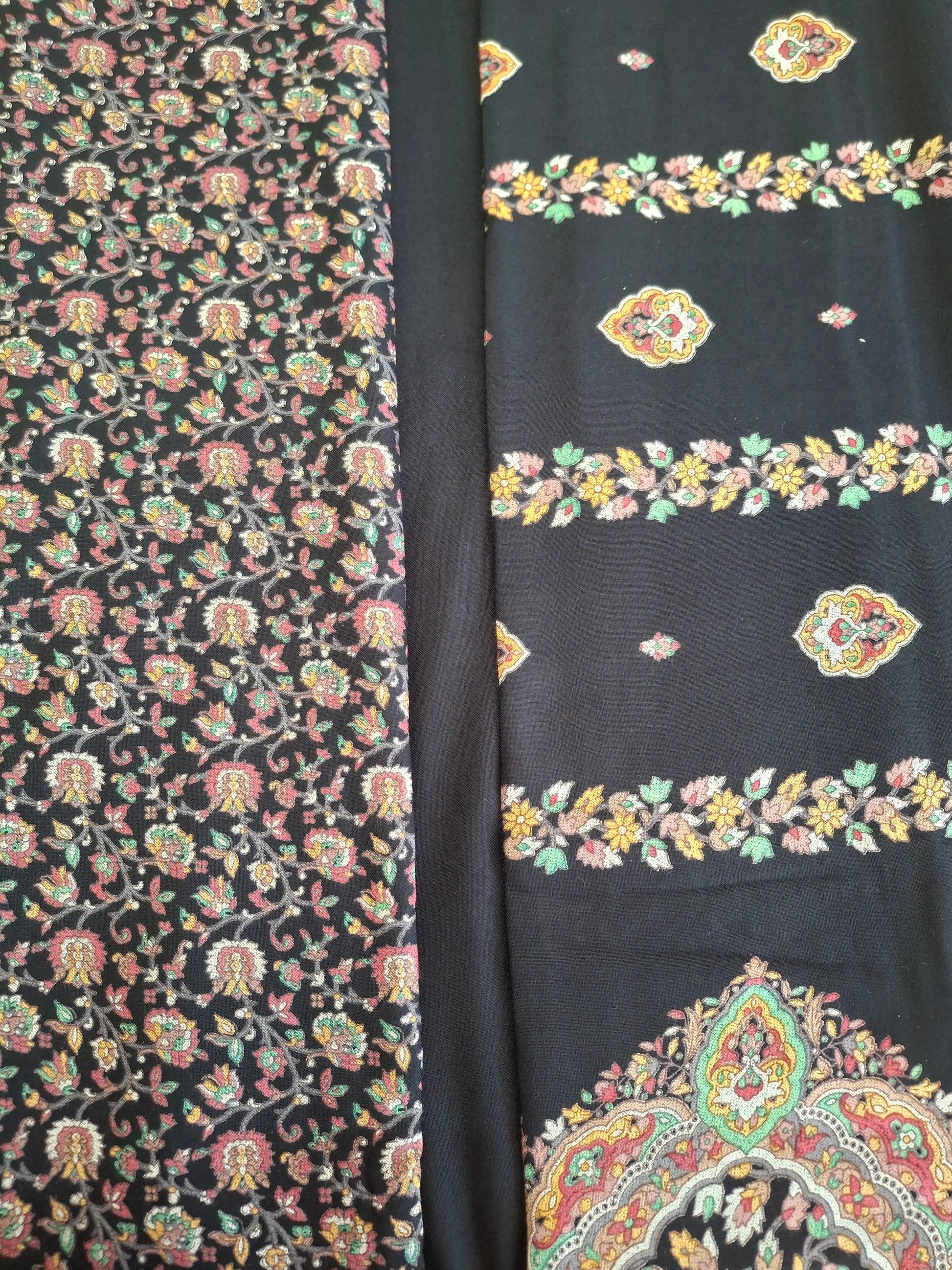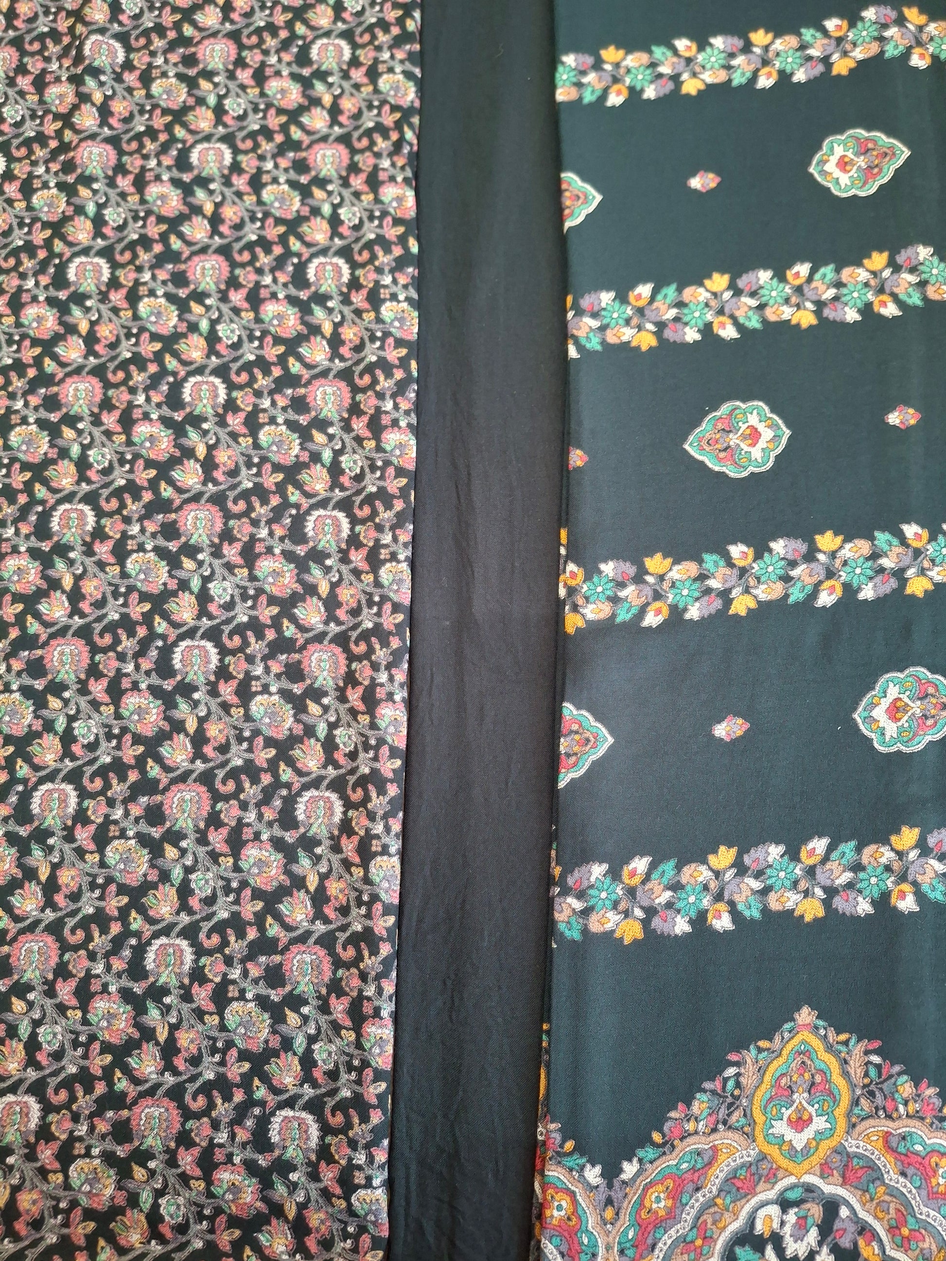 This set includes 2.3 meters for trousers, 2.3meters for a flowing dupatta, and 2.3meters for a perfectly tailored qameez.The width is 60inches.