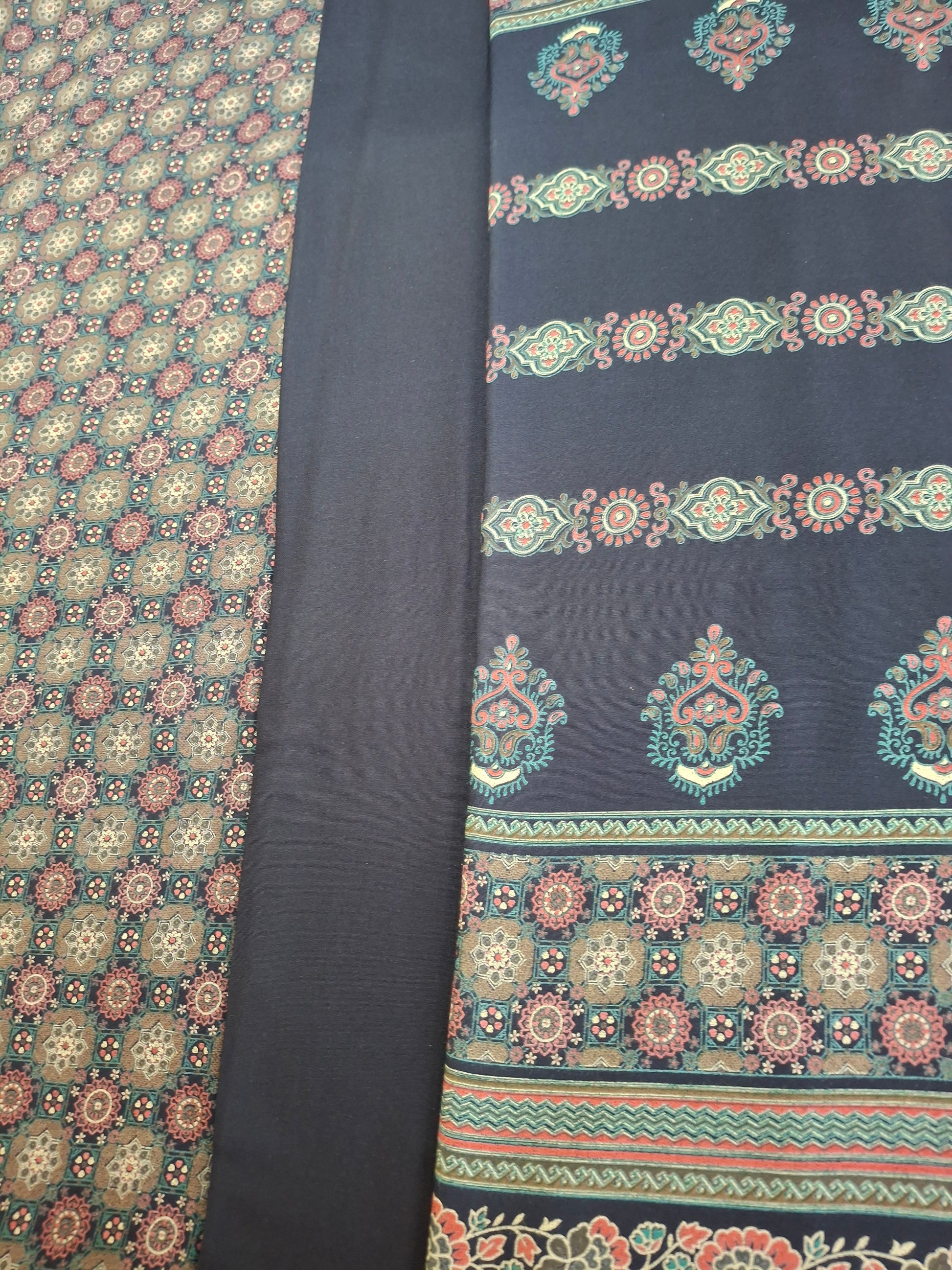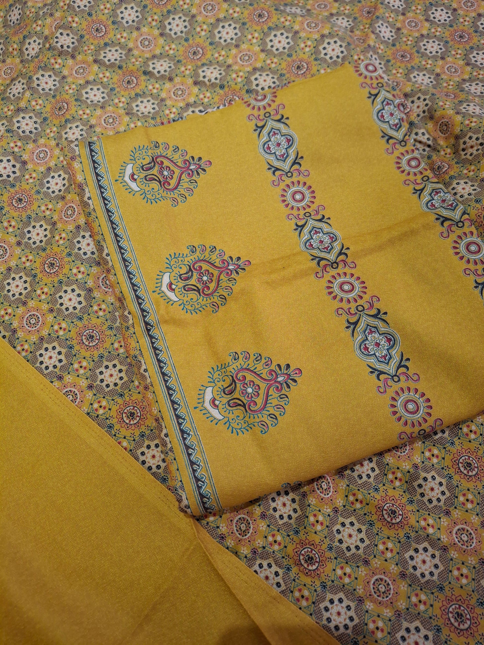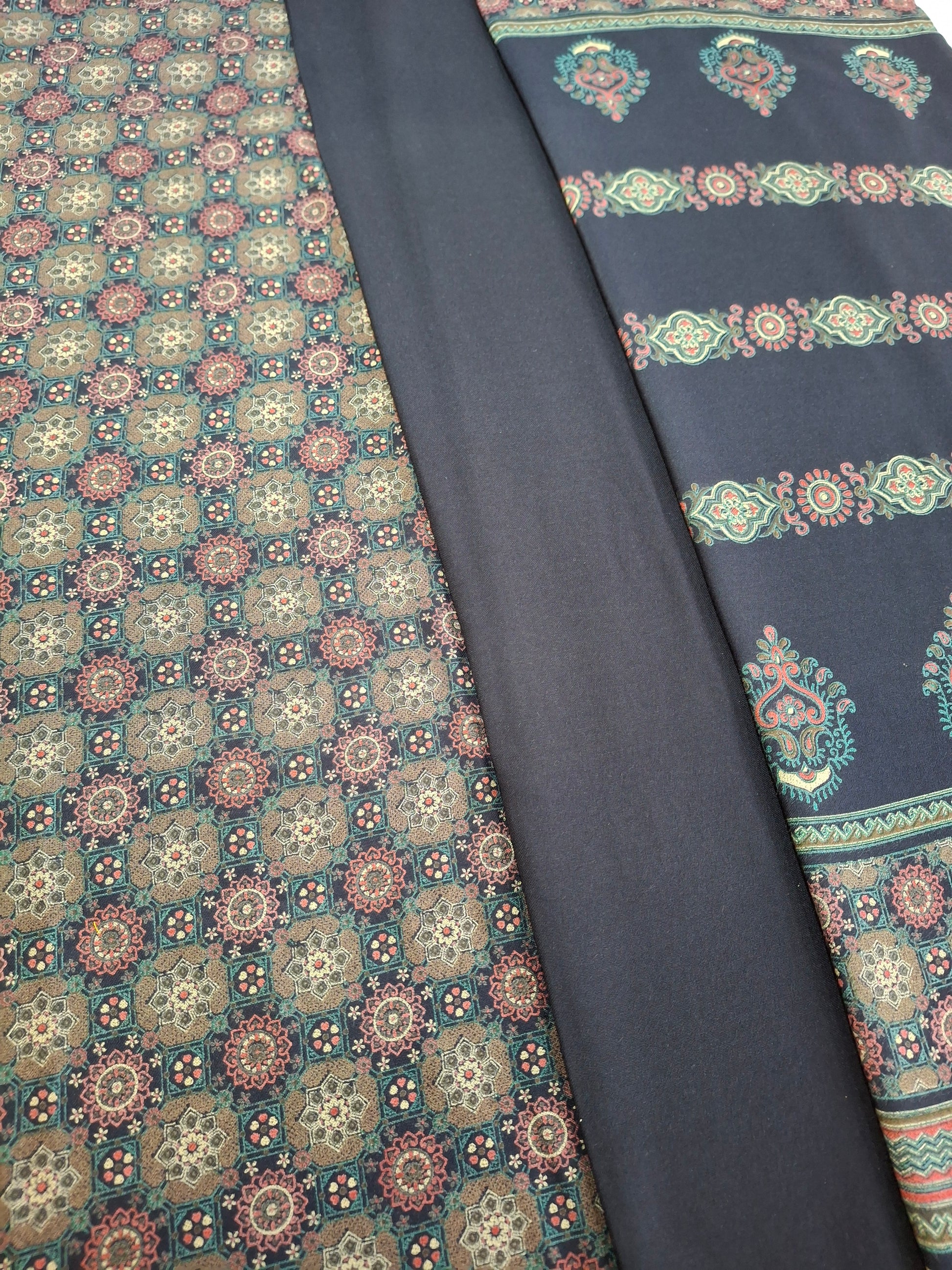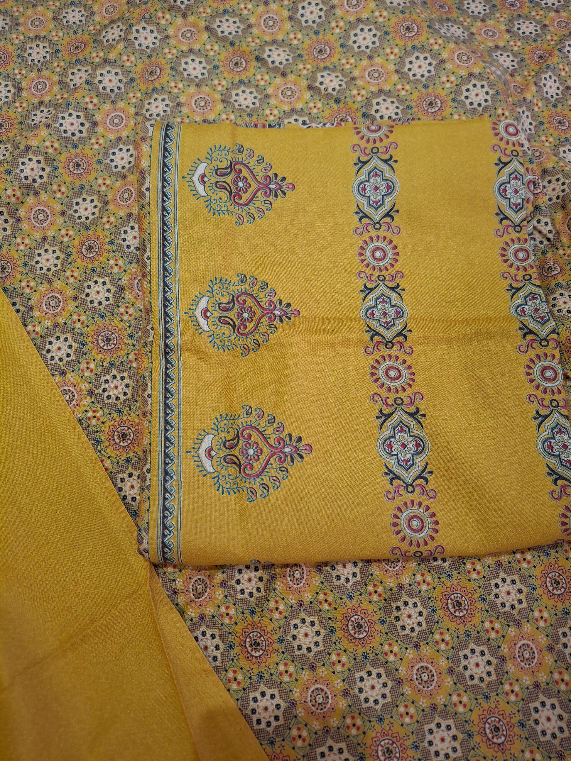 This set includes 2.3 meters for trousers, 2.3meters for a flowing dupatta, and 2.3meters for a perfectly tailored qameez.The width is 60inches.