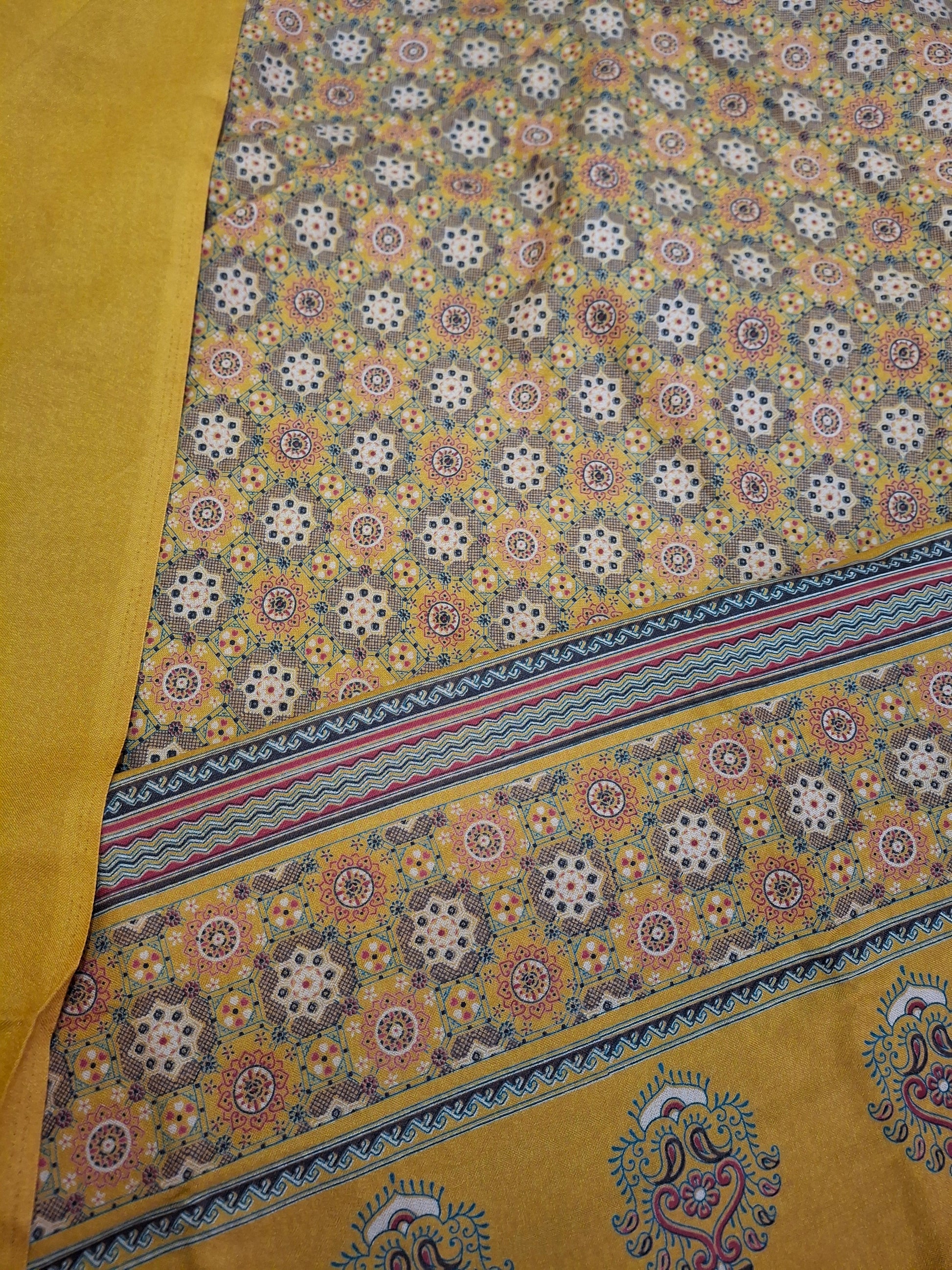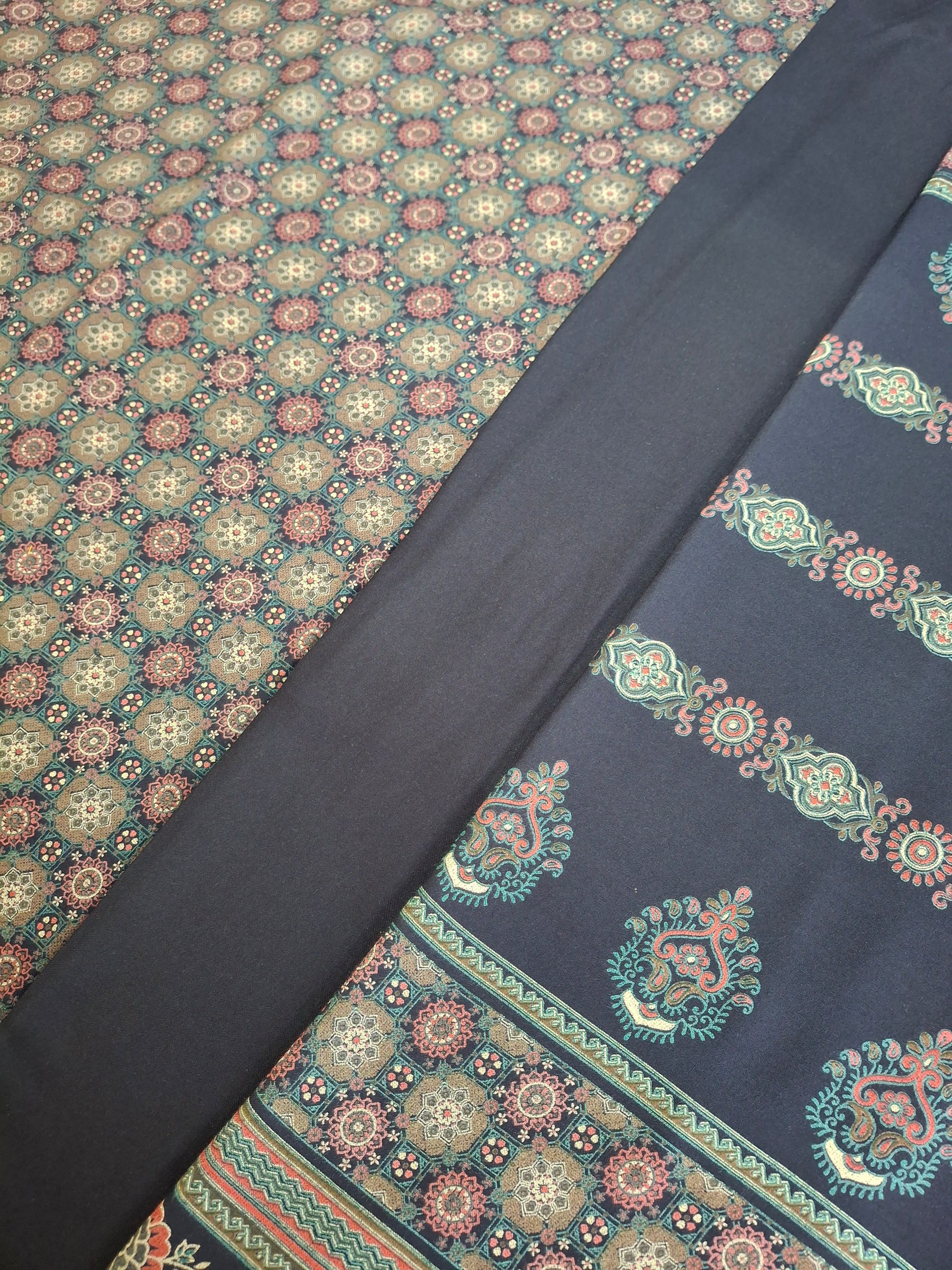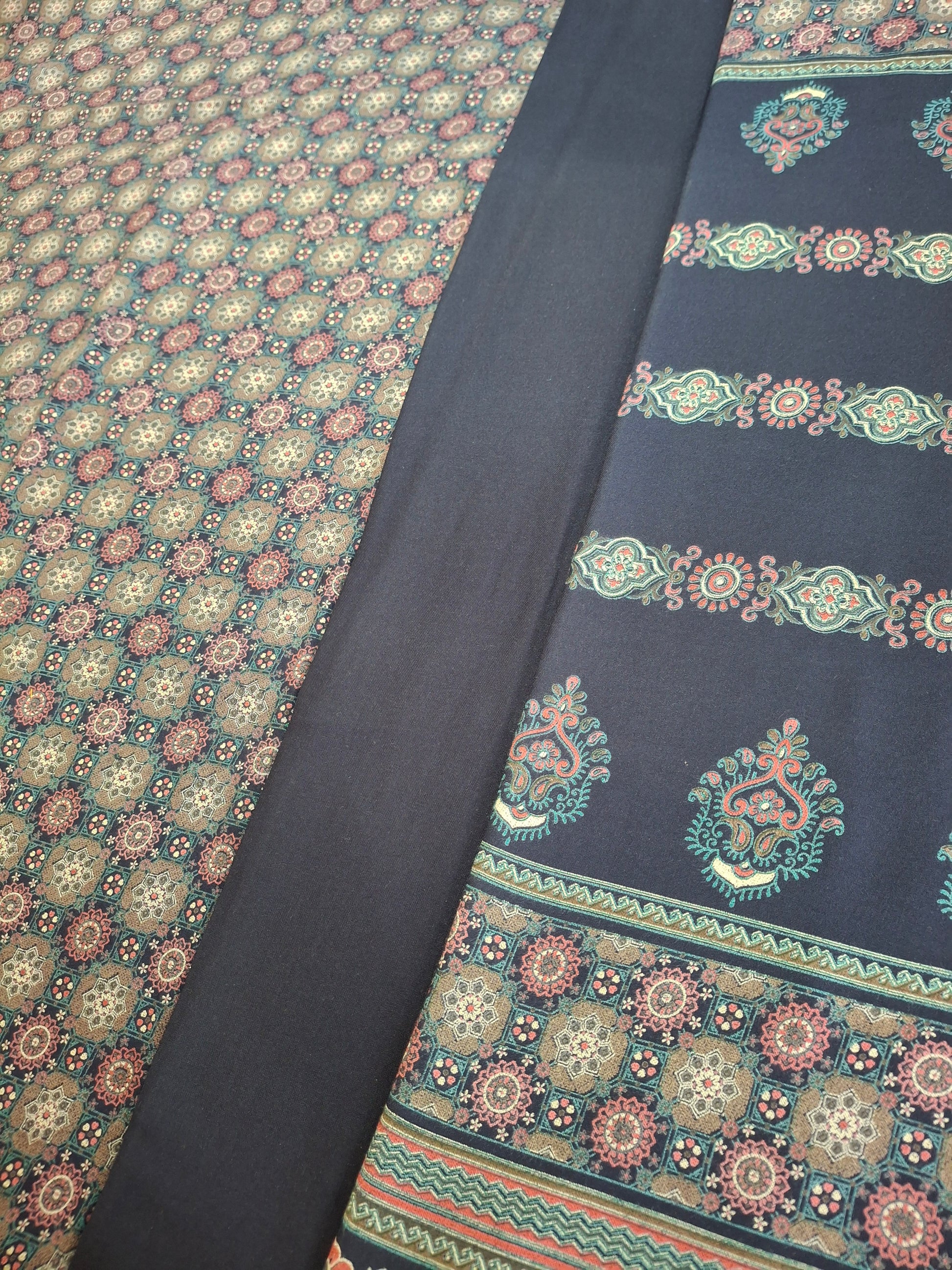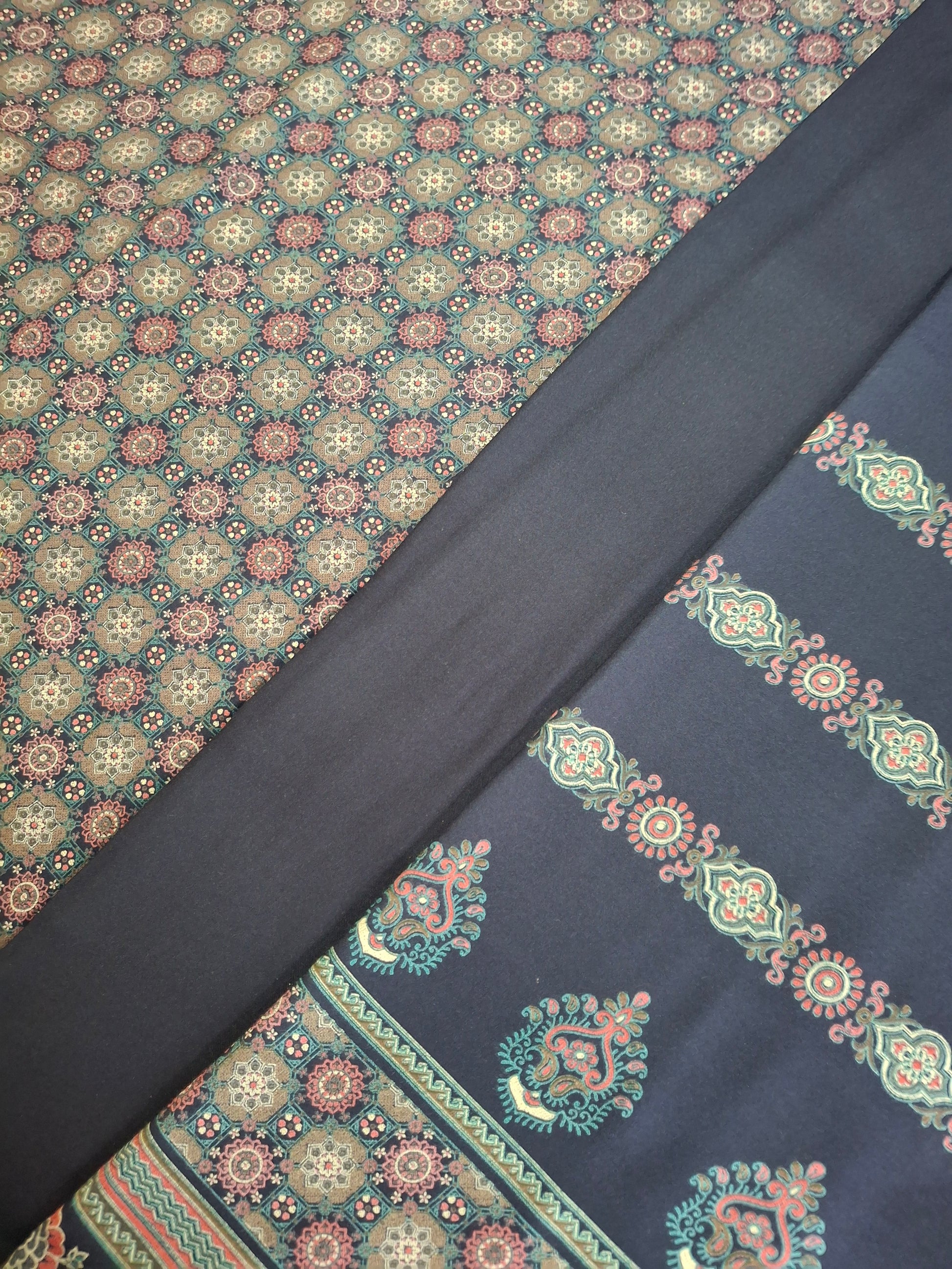 This set includes 2.3 meters for trousers, 2.3meters for a flowing dupatta, and 2.3meters for a perfectly tailored qameez.The width is 60inches.