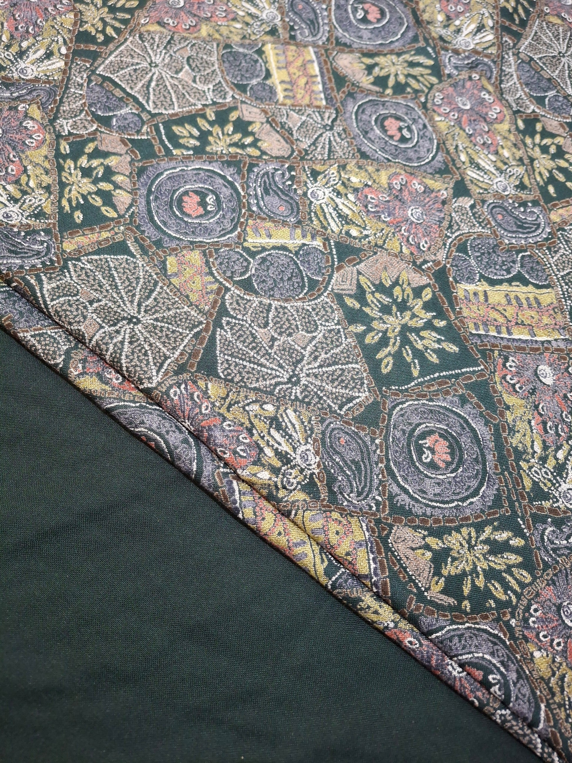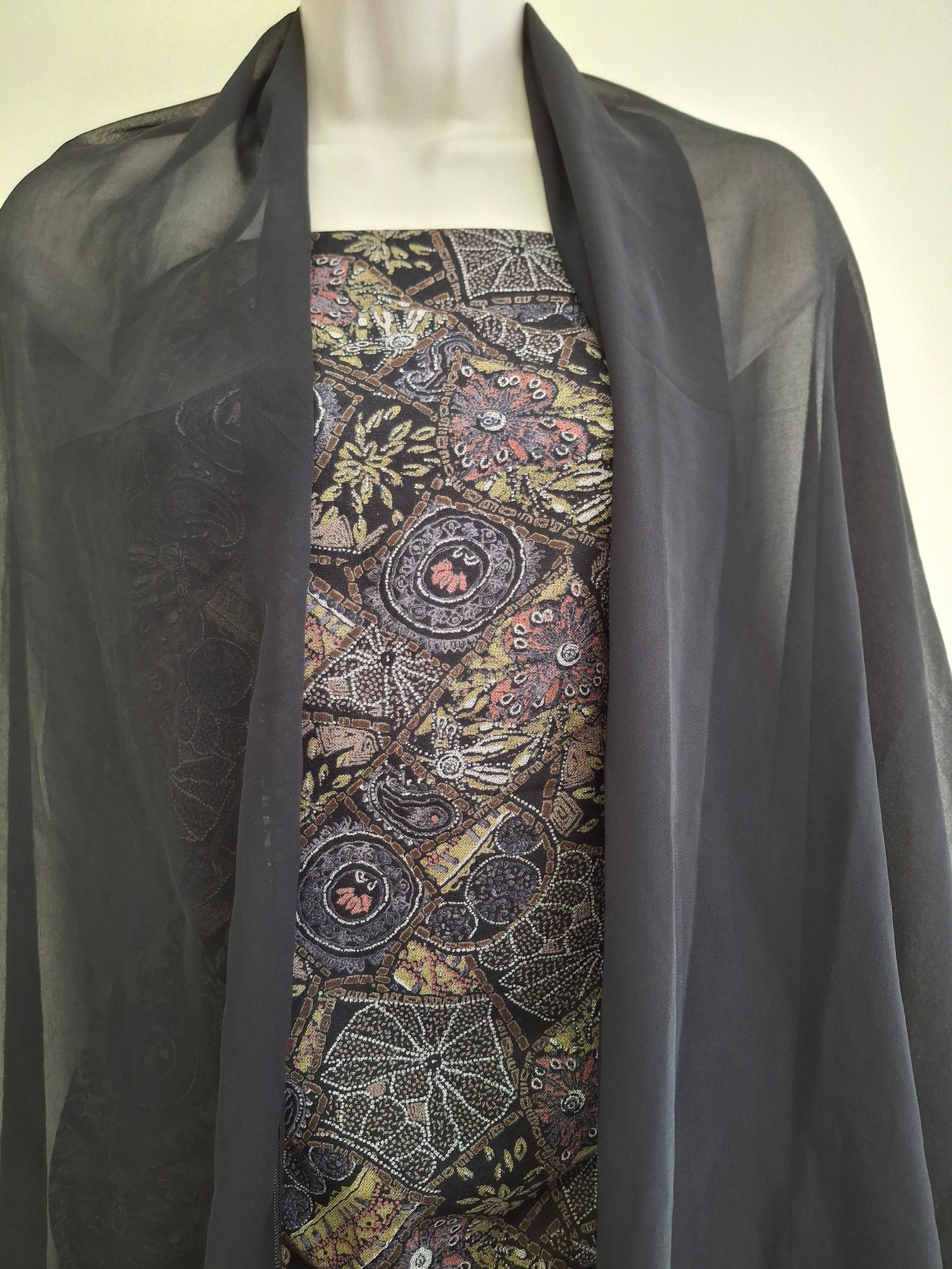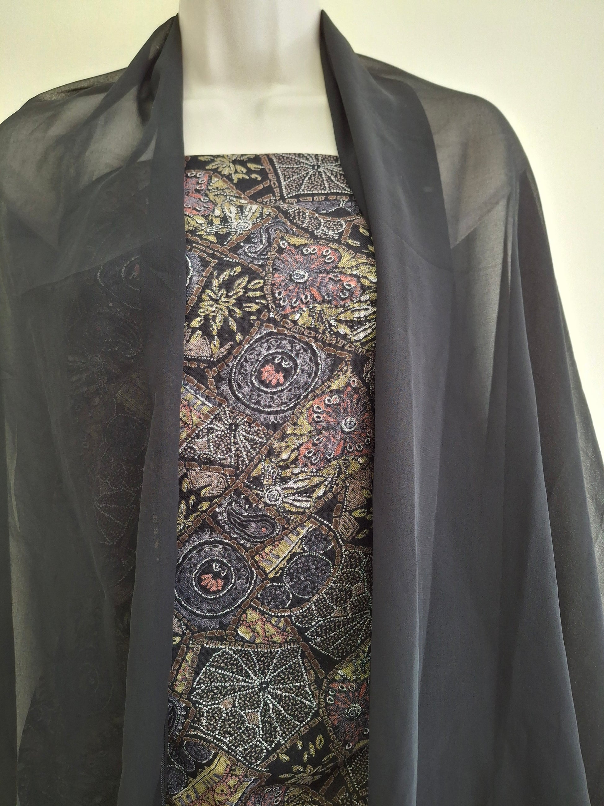 Qameez (Shirt): 2 meters of beautifully patterned fabric in a mix of navy, beige, and subtle pastel tones, designed with intricate floral and geometric motifs that give a rich and elegant look.