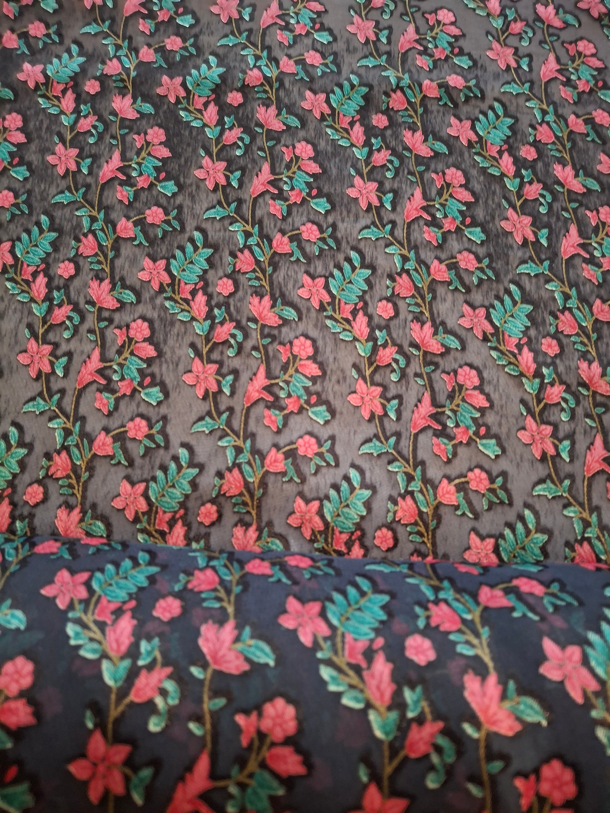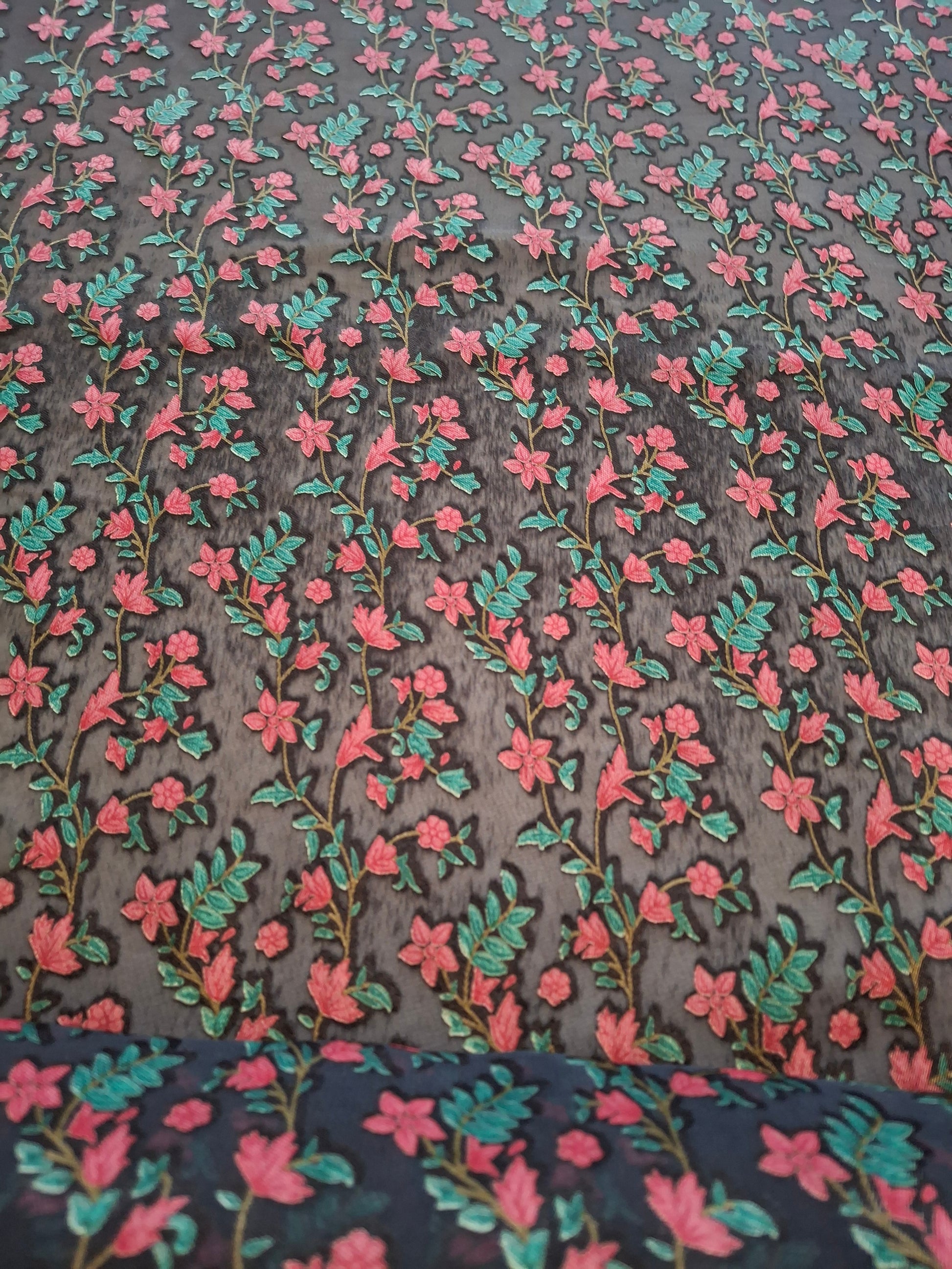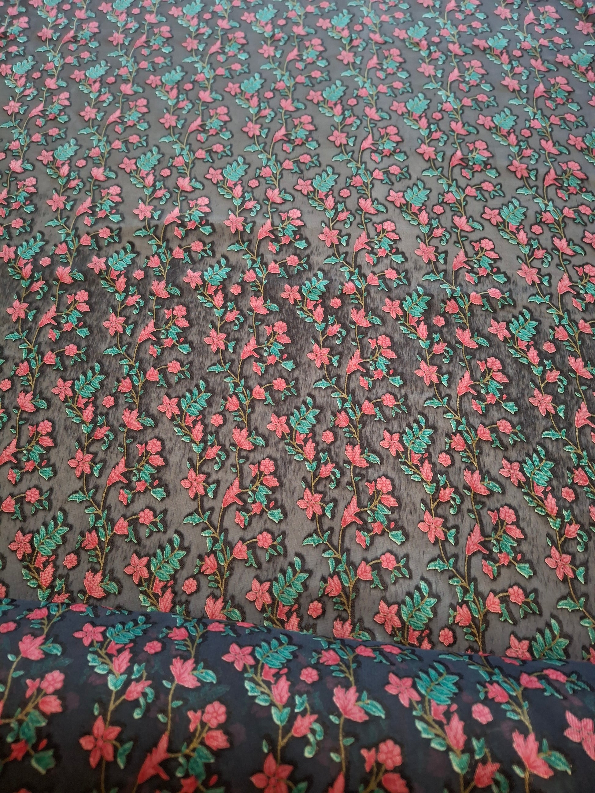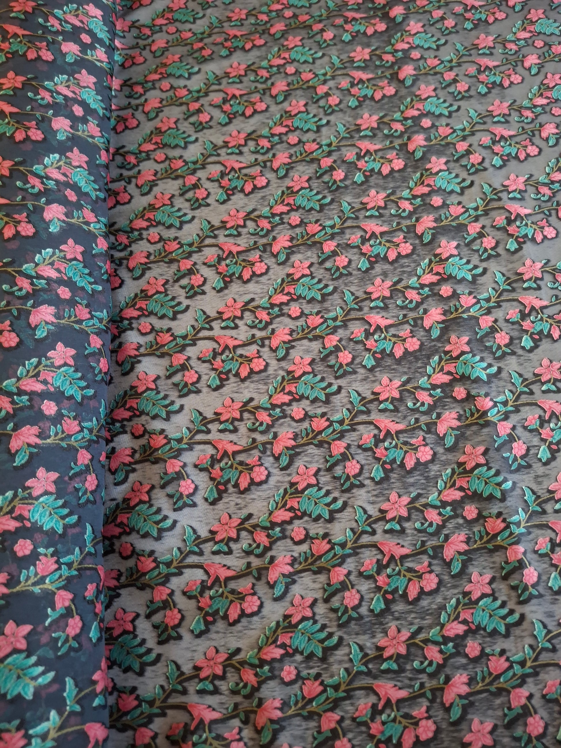 This fabric is made from Baroshia material, known for its smooth texture and durability. It features a delicate floral printed pattern with pink flowers and green leaves, arranged in vertical vine-like rows. The print is done on a dark base fabric, which enhances the contrast and makes the colors pop.You can add a lining to the garment yourself to avoid see-through. Choose a lightweight fabric that matches or complements the fabric, and attach it as a lining to ensure a more opaque finish.