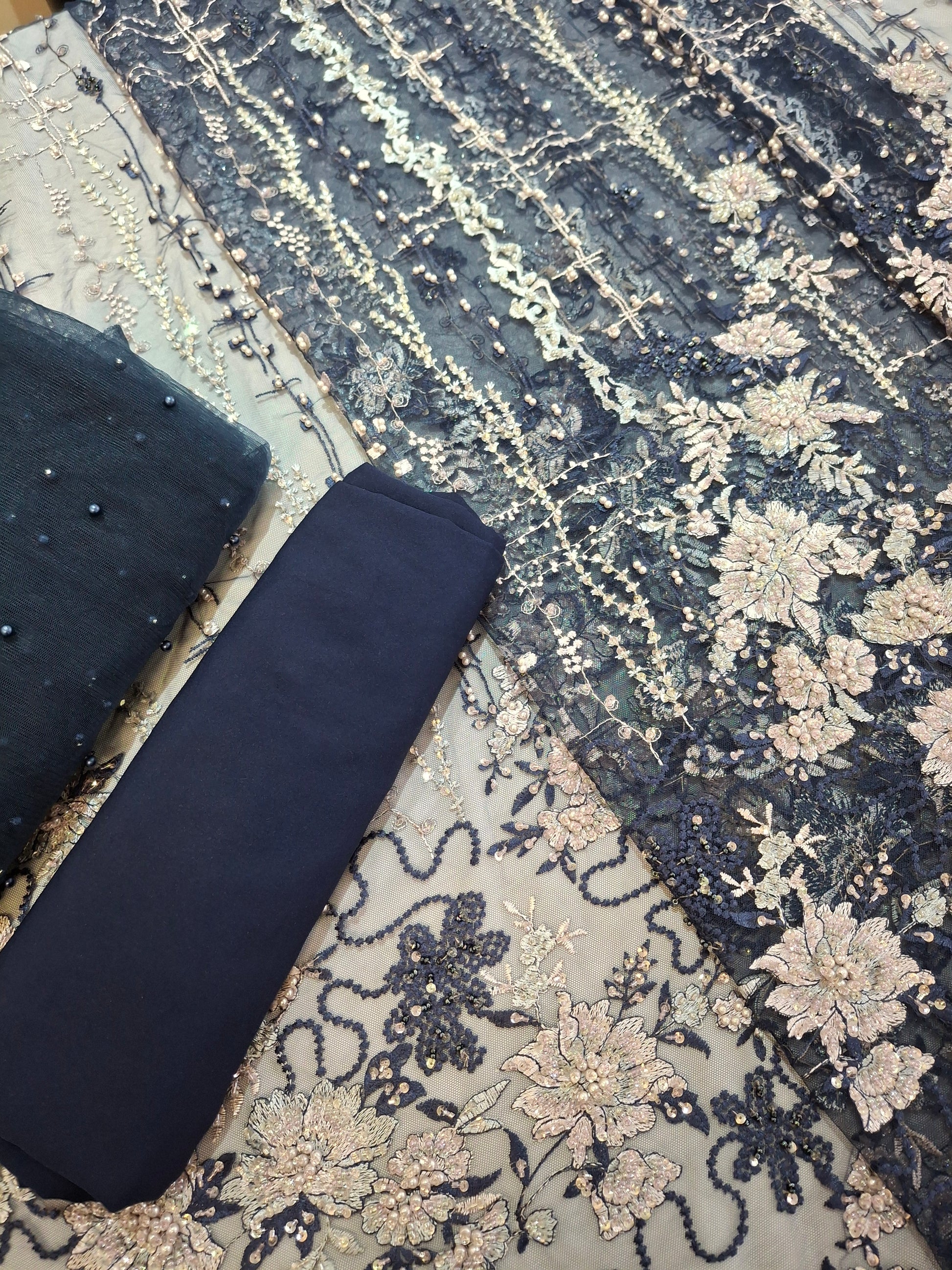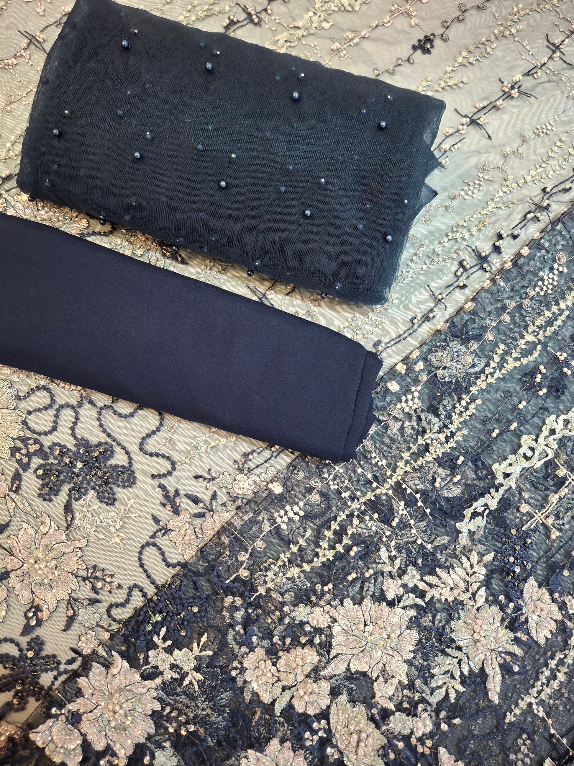 An elegant unstitched suit set beautifully adorned with intricate sequin embroidery for a timeless and regal appeal. The set includes: