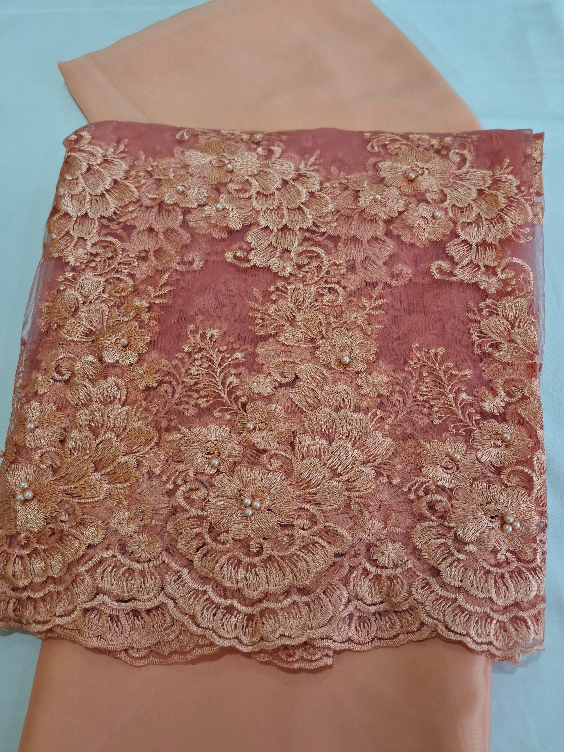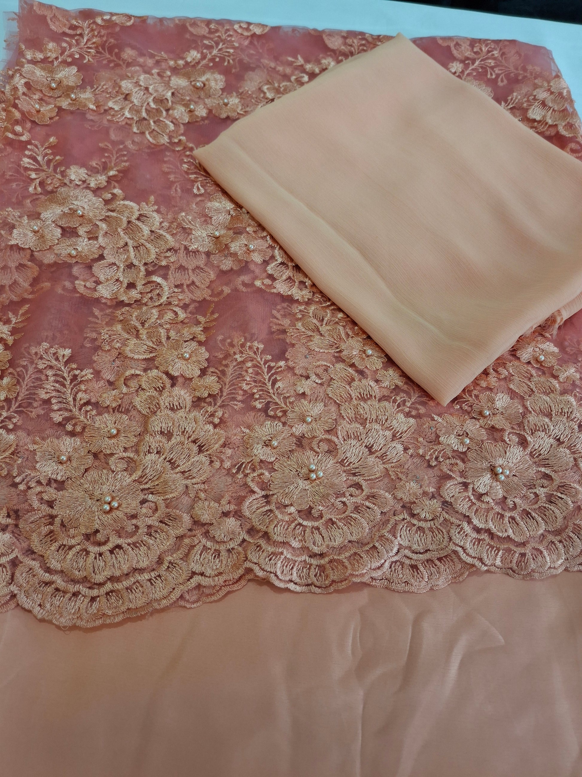 This elegant embroidered net suit set is beautifully crafted with intricate floral embroidery and delicate bead embellishments on a soft peach base. Paired with a smooth shamoz silk lining and plain chiffon dupatta, this unstitched ensemble offers timeless grace and sophistication.