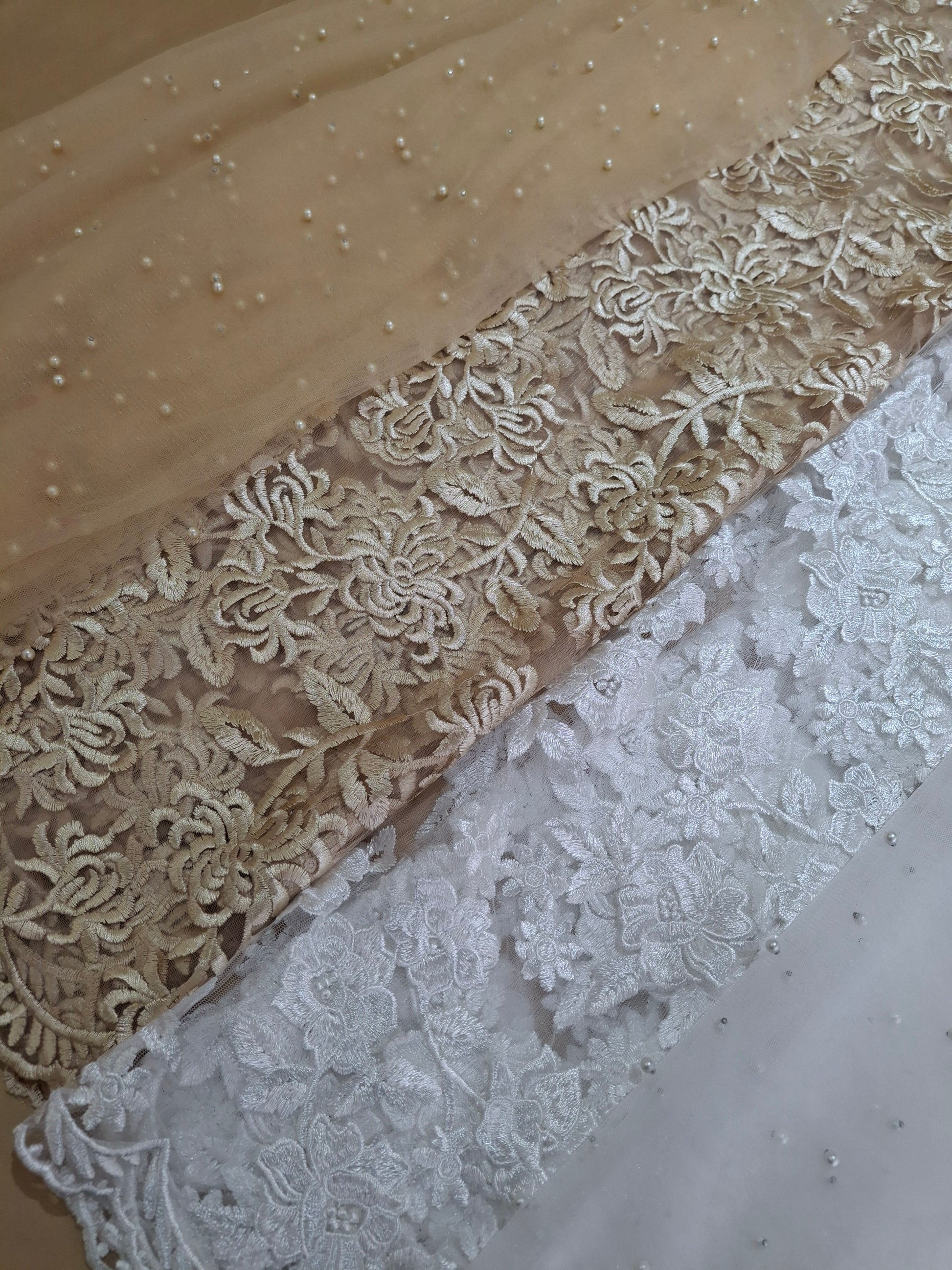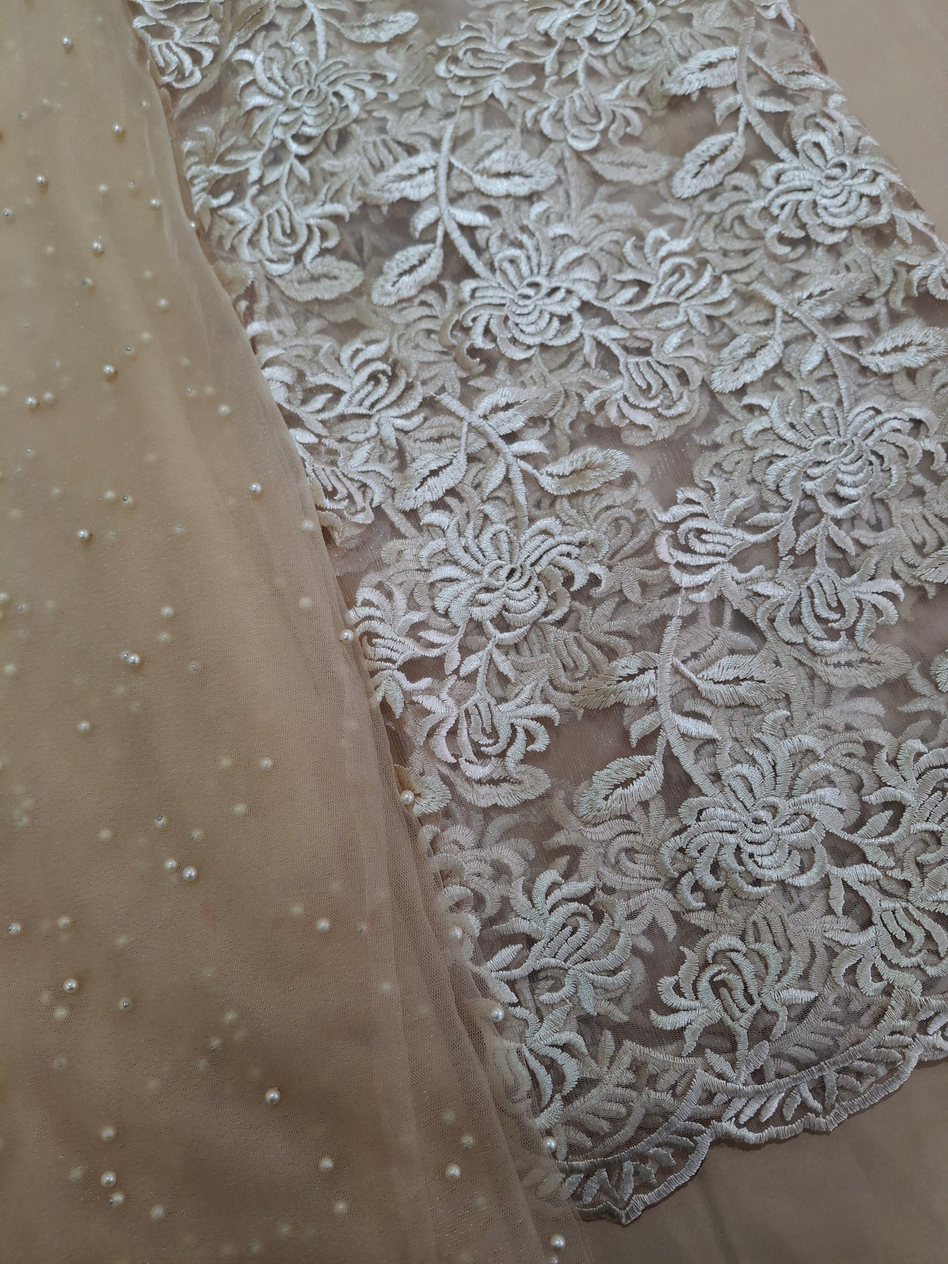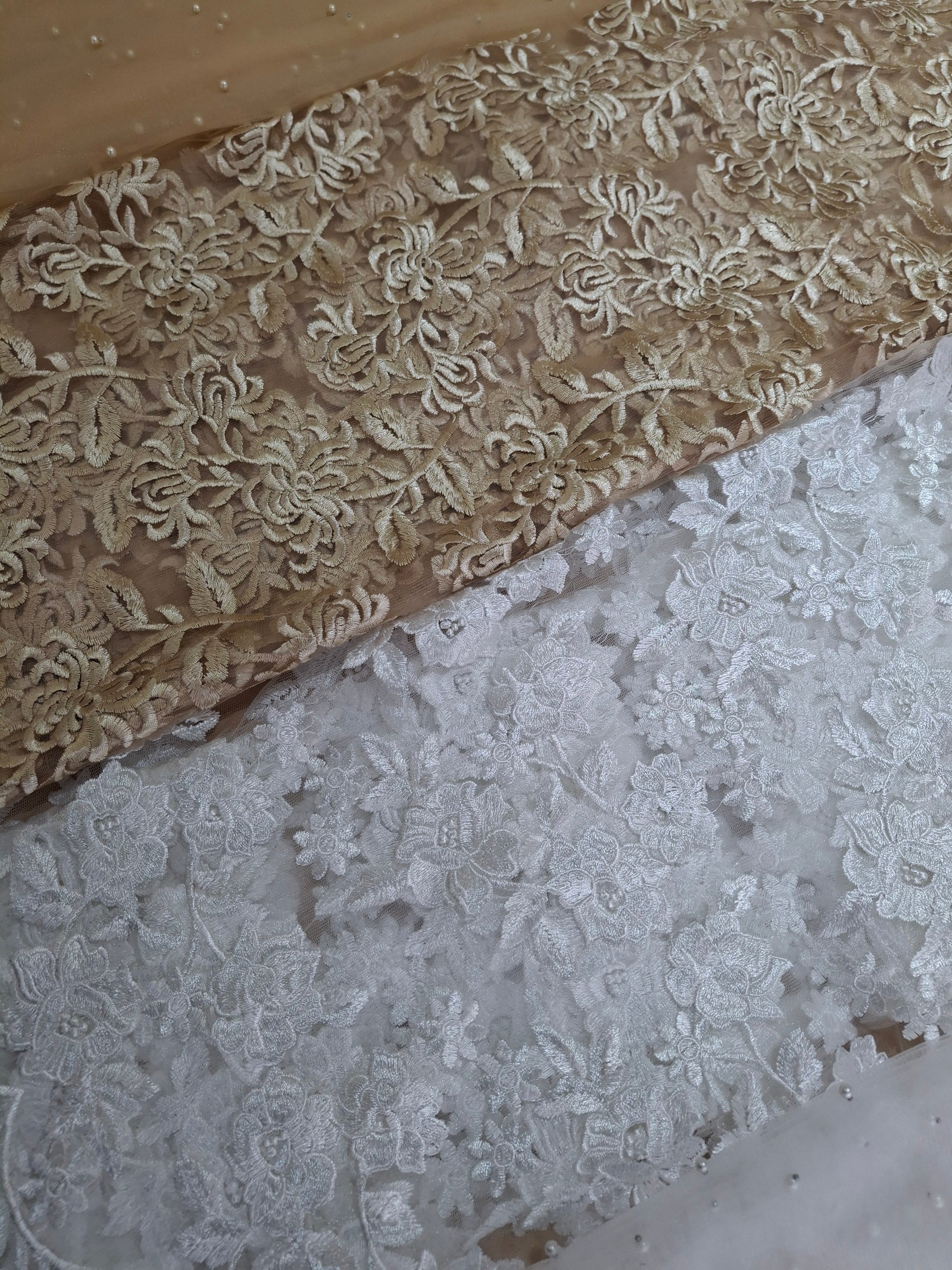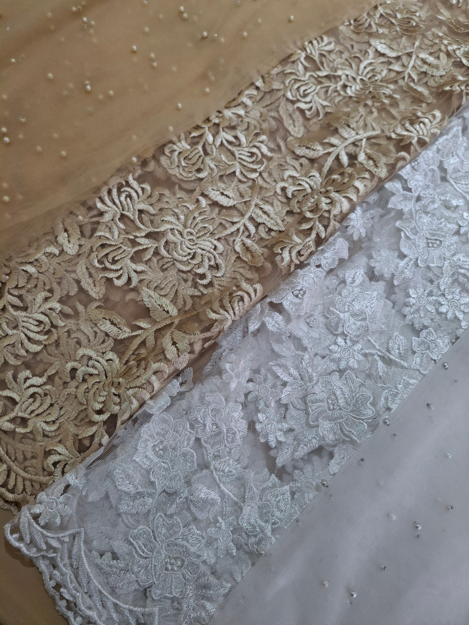 This stunning embroidered net lace fabric features intricate floral patterns adorned with embroidery adding a touch of glamour.