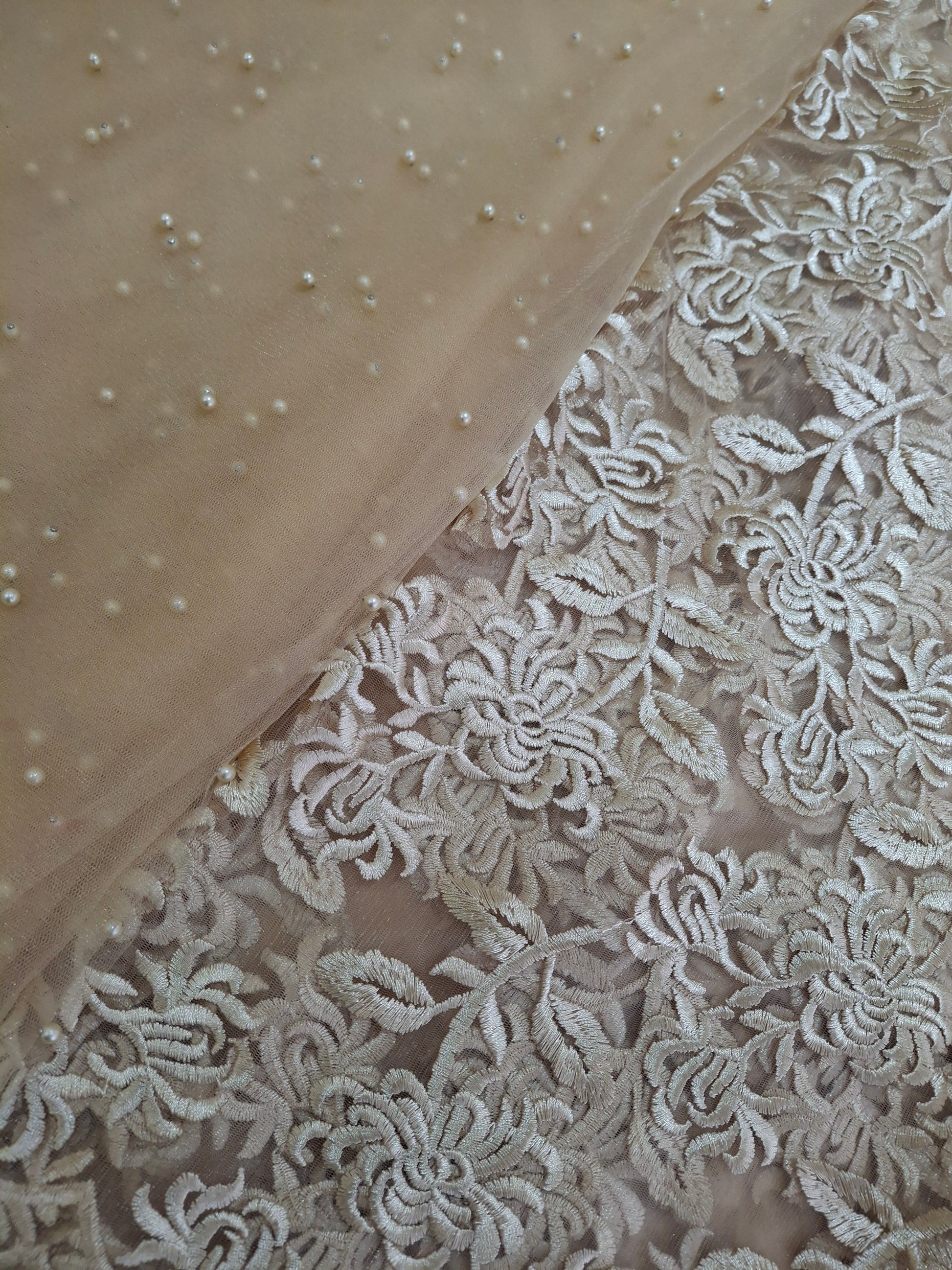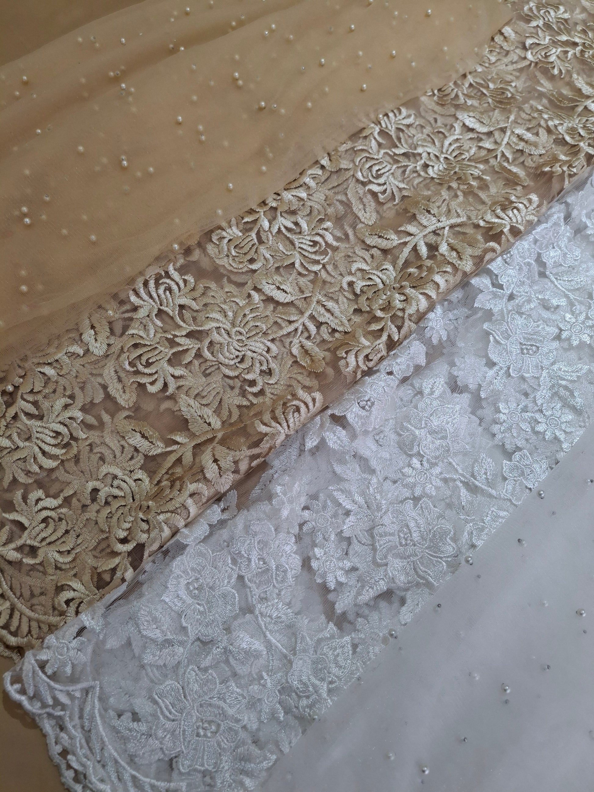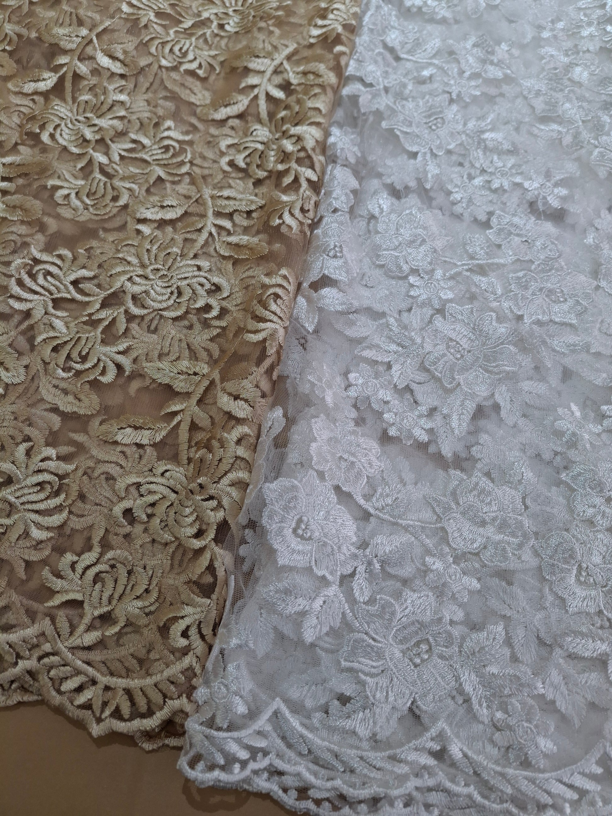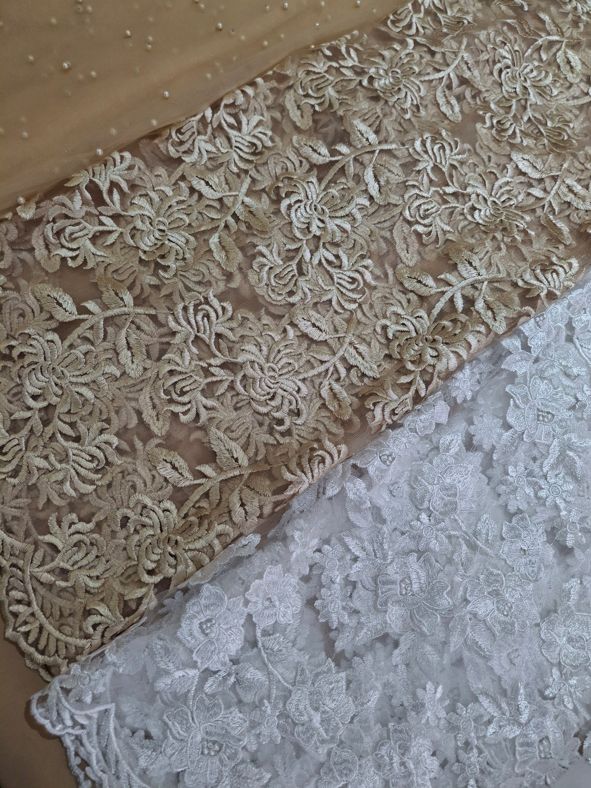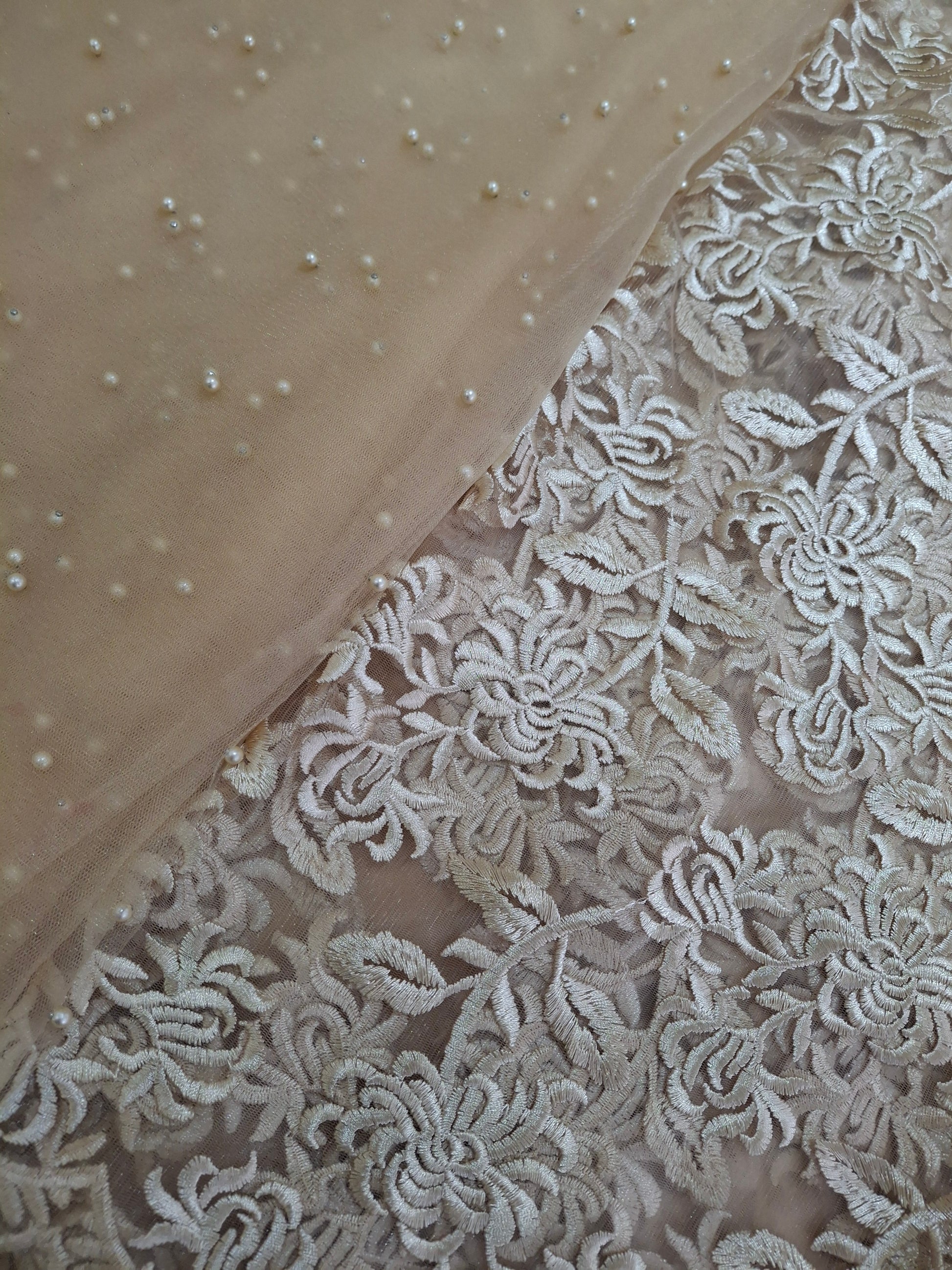 This stunning embroidered net lace fabric features intricate floral patterns adorned with embroidery adding a touch of glamour.
