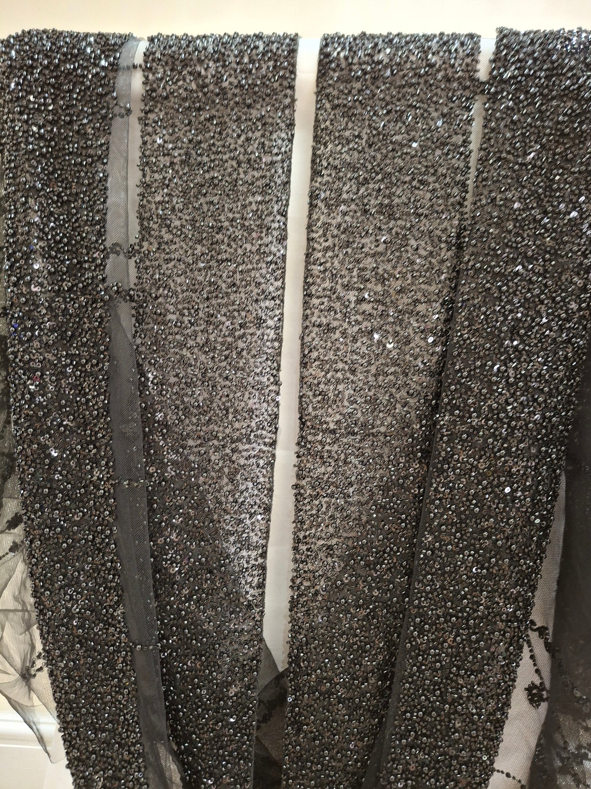 This luxurious embroidered(cutdana work)net lace fabric, 44 inches wide, is adorned with shimmering sequins and elegant threadwork in vertical patterns with diamond motifs. The scalloped border with dense embroidery and sparkling details adds a graceful finishing touch.