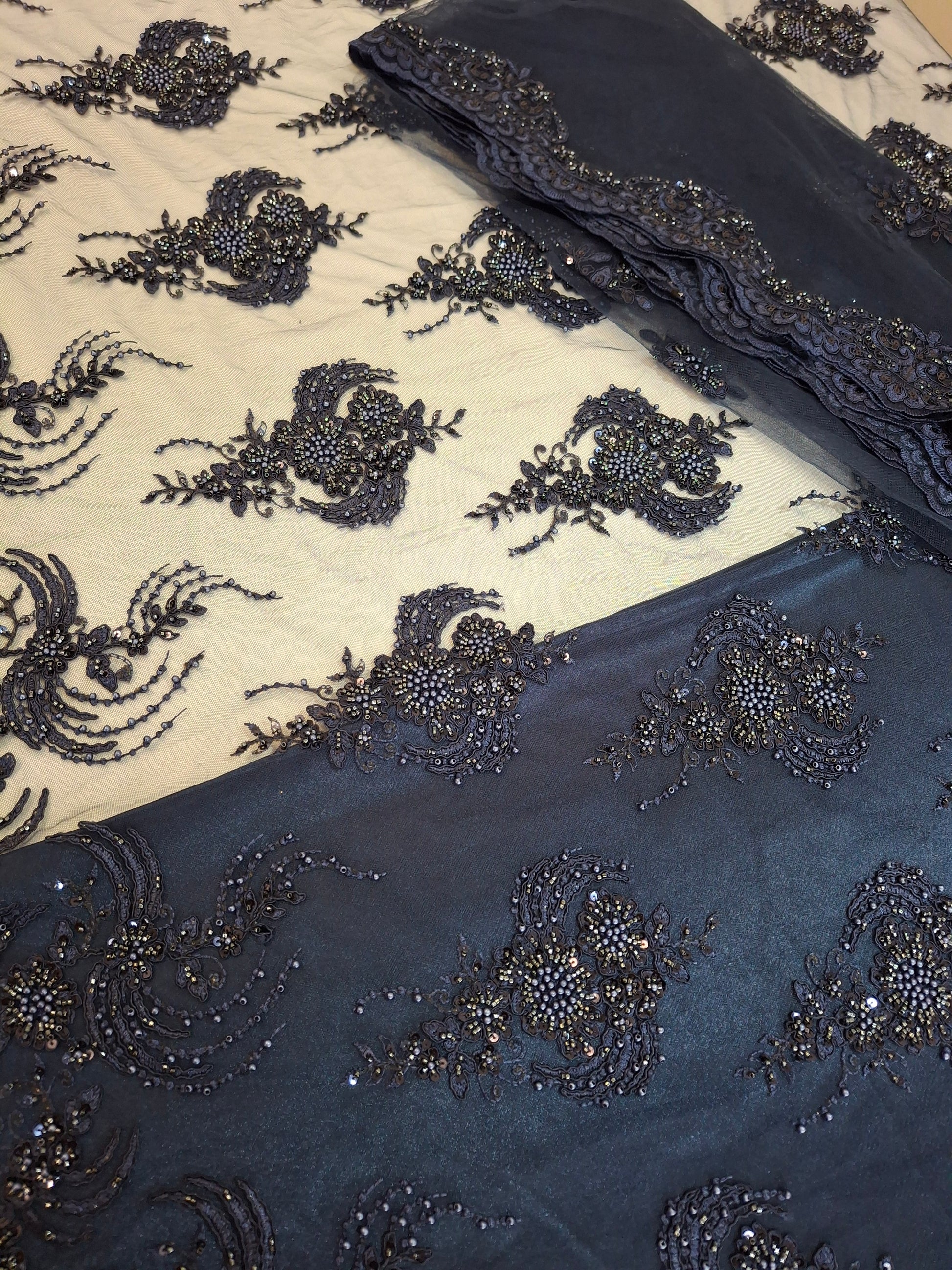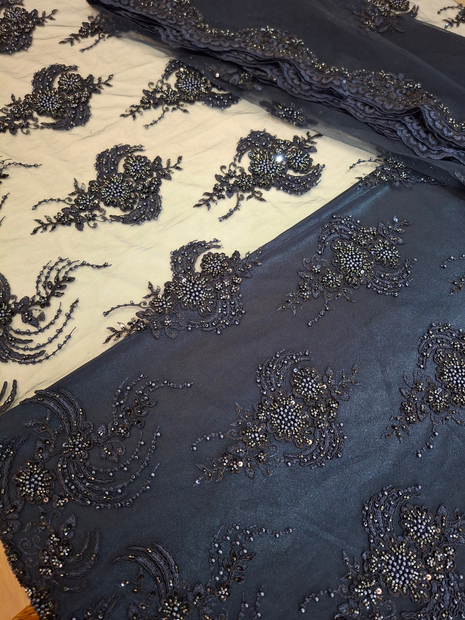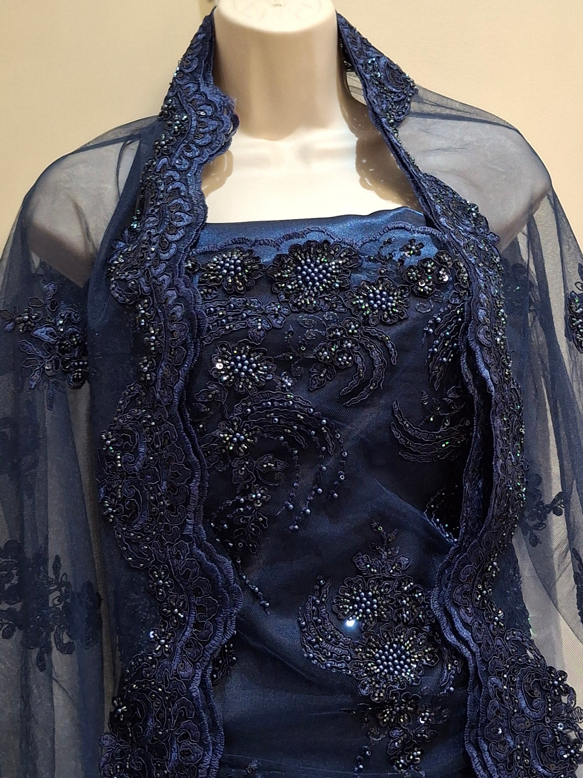 Elegant navy blue 4-piece ladies suit crafted from premium net fabric with intricate bead and thread embroidery. The set includes: