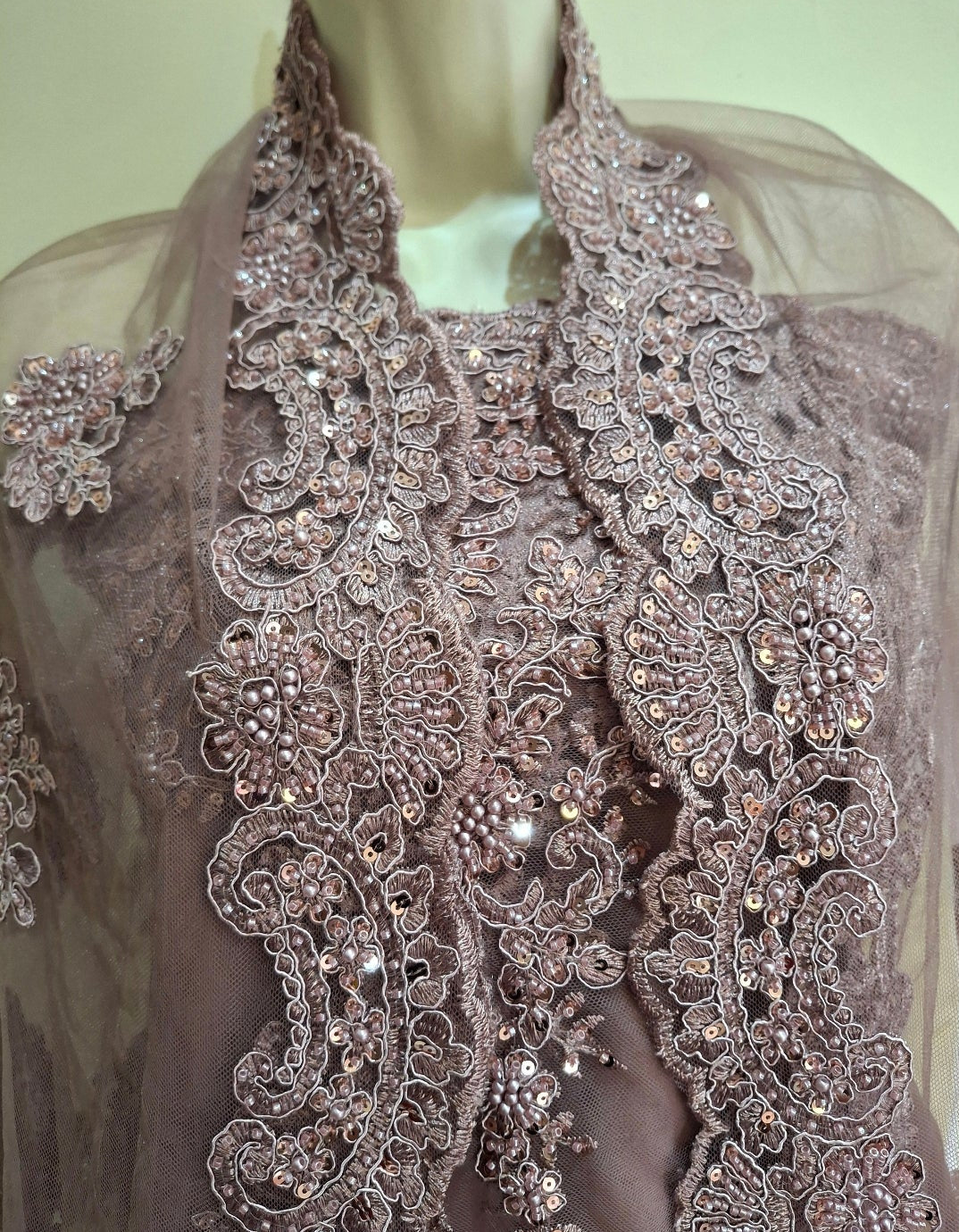 Dupatta: 2.3 meters of matching net dupatta with embroidered borders.