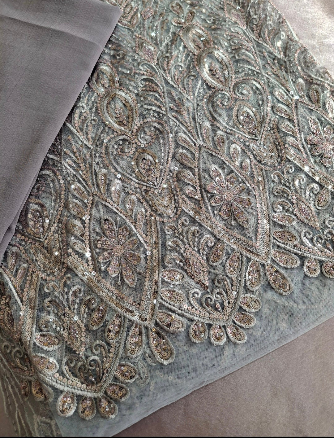 An elegant unstitched suit set beautifully adorned with intricate sequin embroidery for a timeless and regal appeal. The set includes: