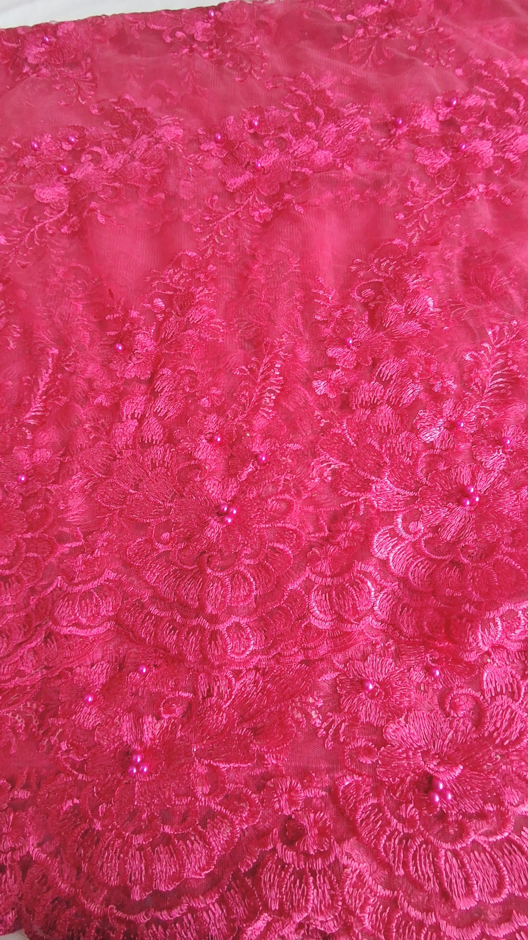 Vibrant hot pink lace fabric adorned with intricate satin-thread floral embroidery and delicate 3D bead embellishments. You can add a lining to the garment yourself to avoid see-through. Choose a lightweight fabric that matches or complements the eyelet fabric, and attach it as a lining to ensure a more opaque finish.