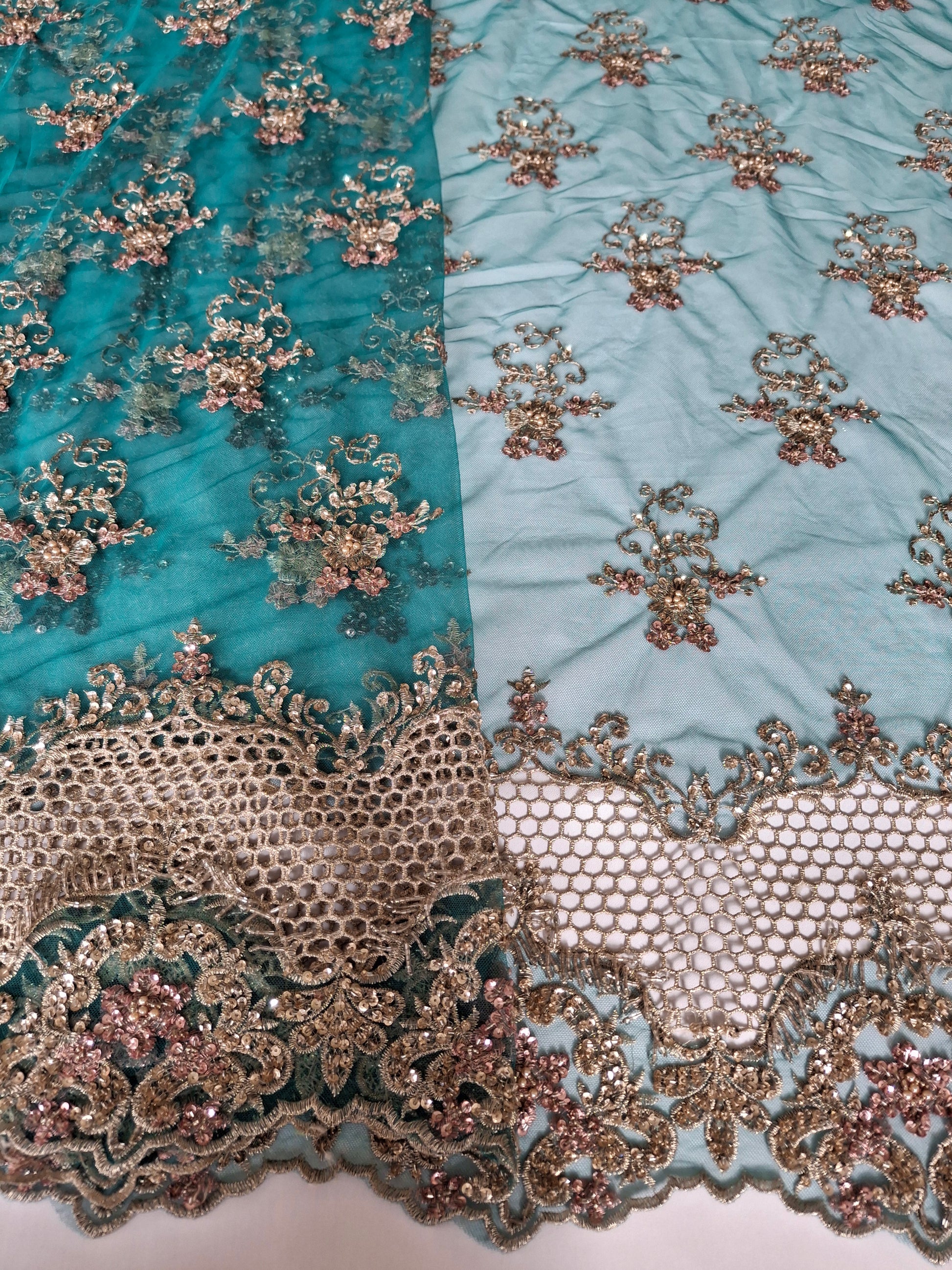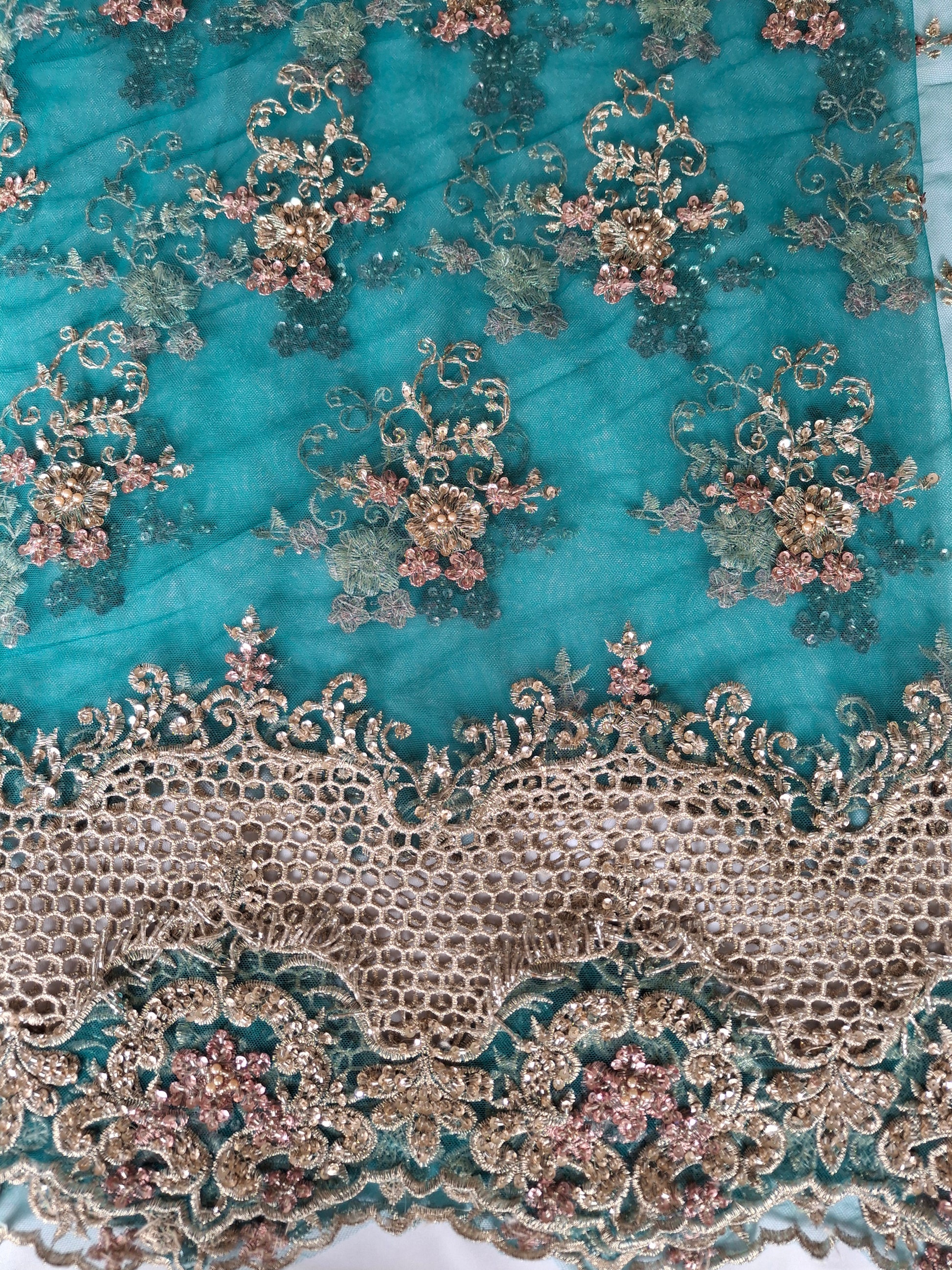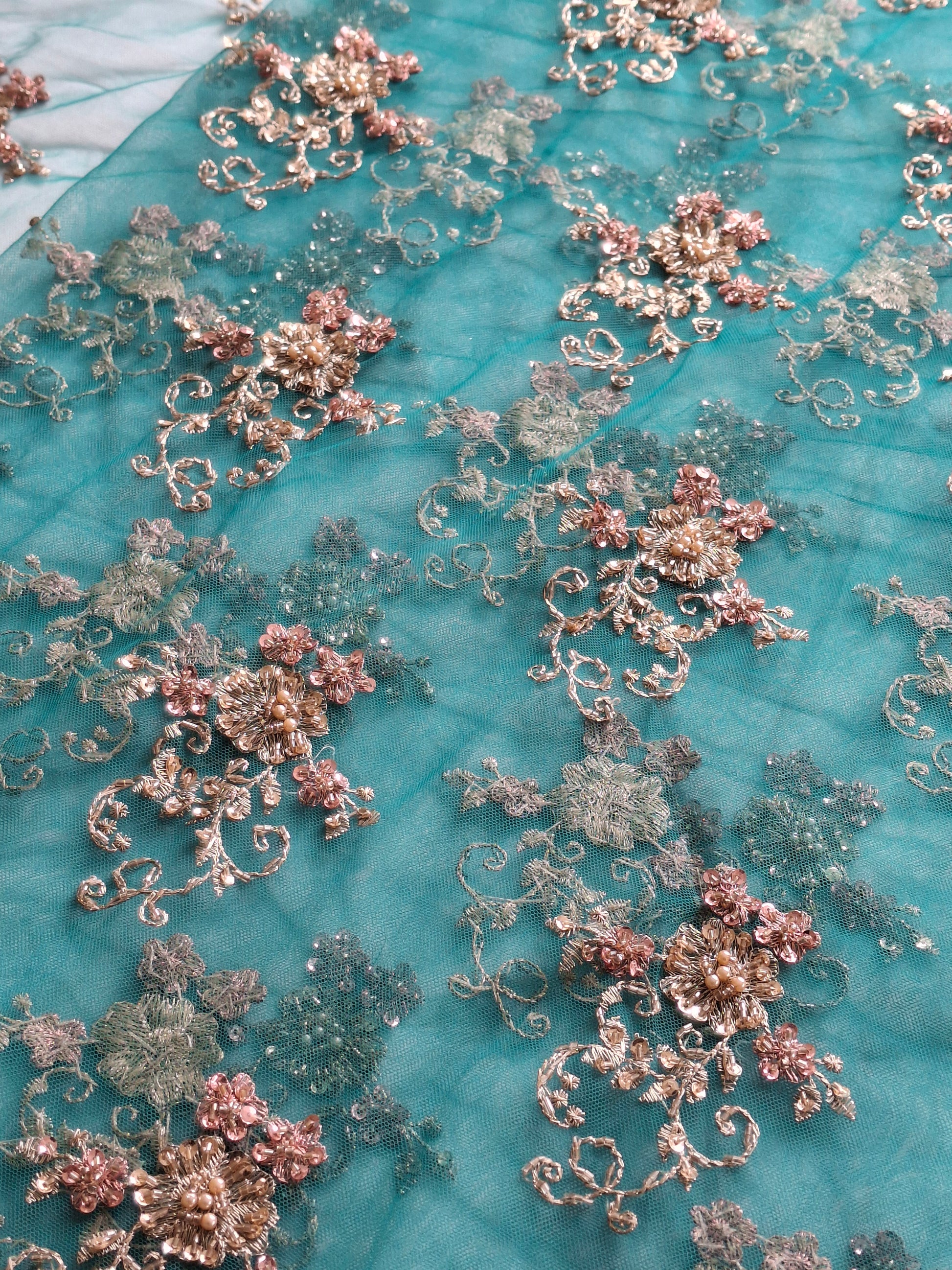 This premium embroidered net fabric features a rich sea green base adorned with golden threadwork, sequins, and delicate green floral highlights. The intricate design combines floral patterns with mesh detailing, creating a luxurious and elegant look.
