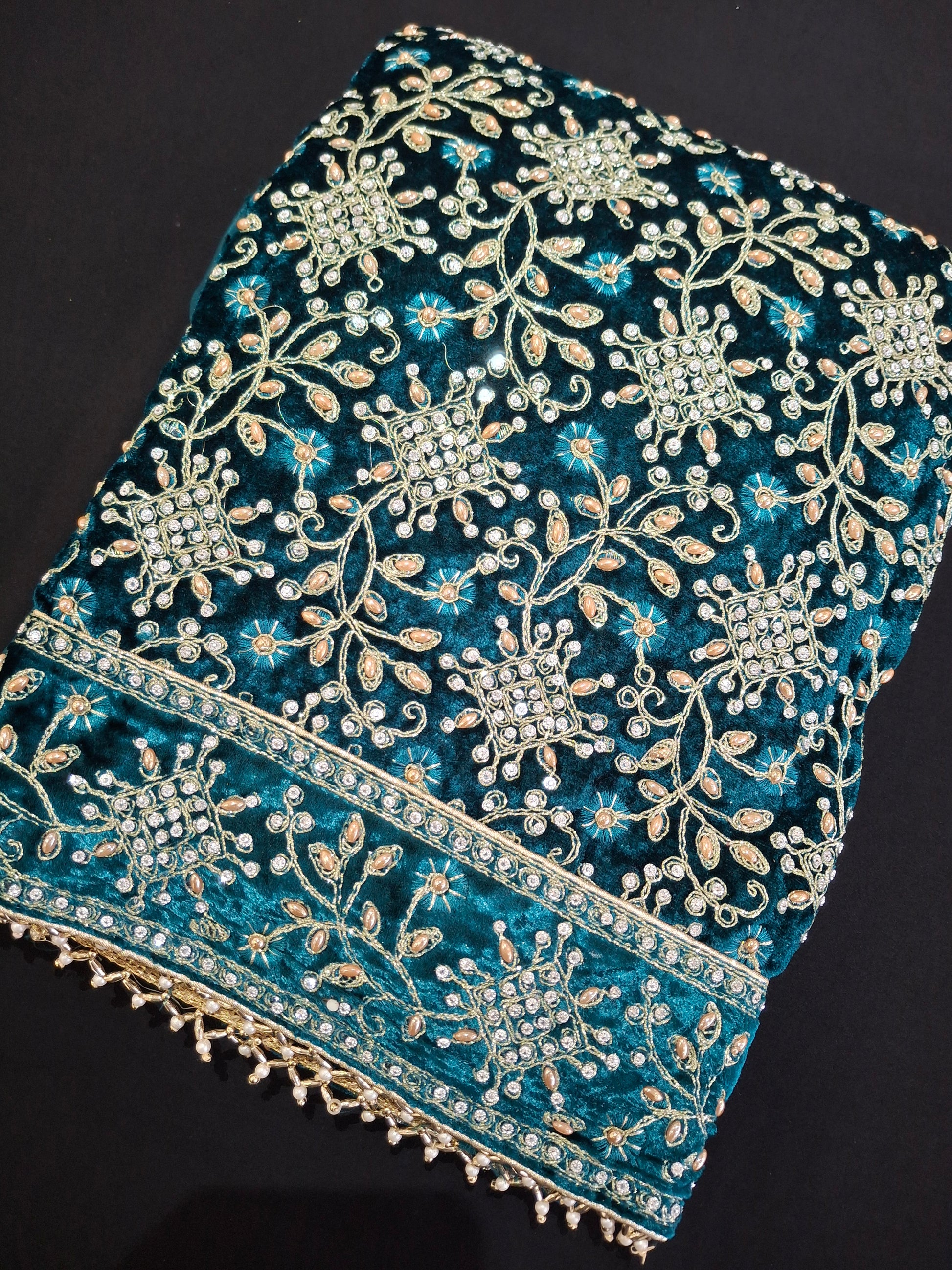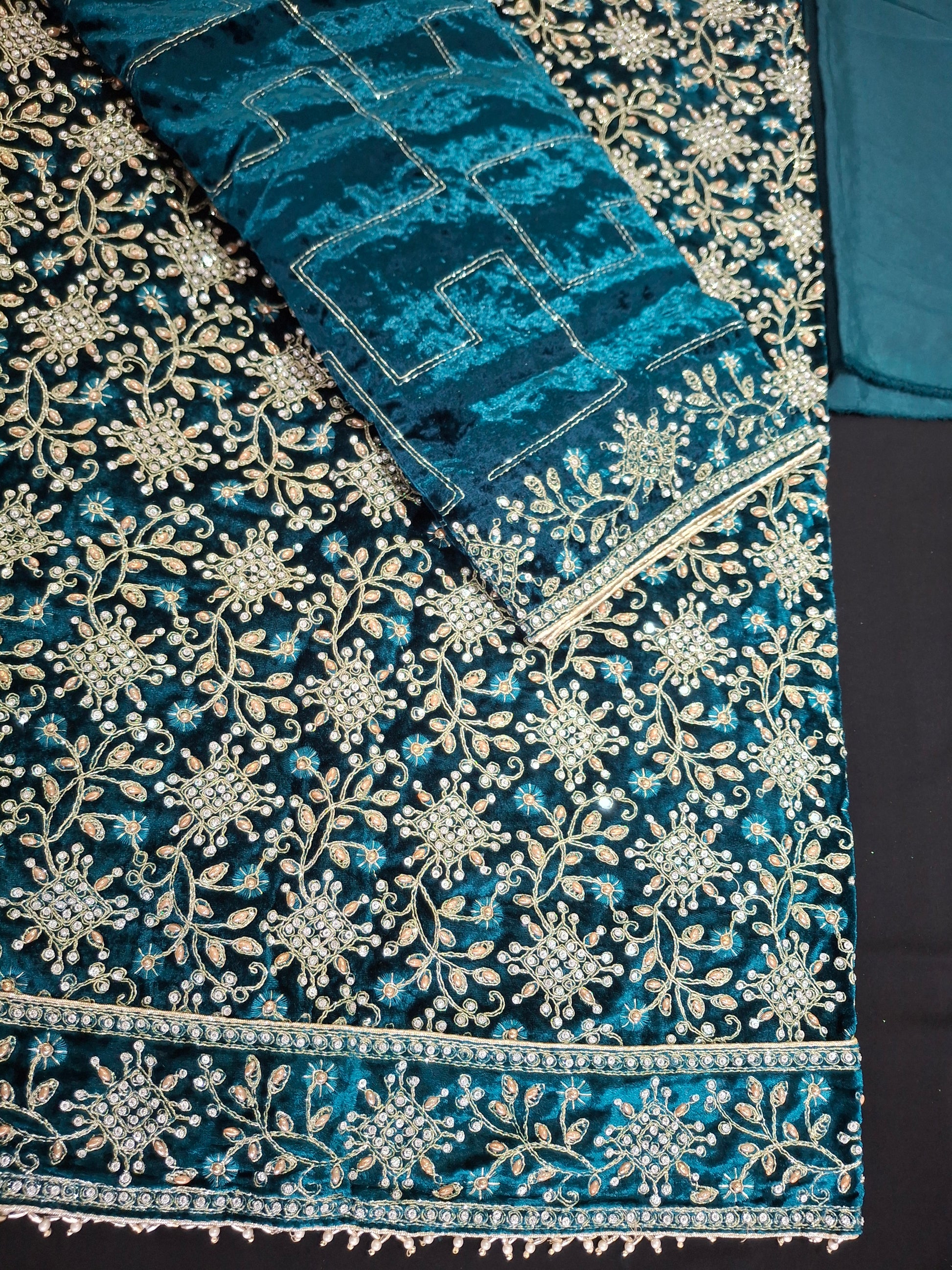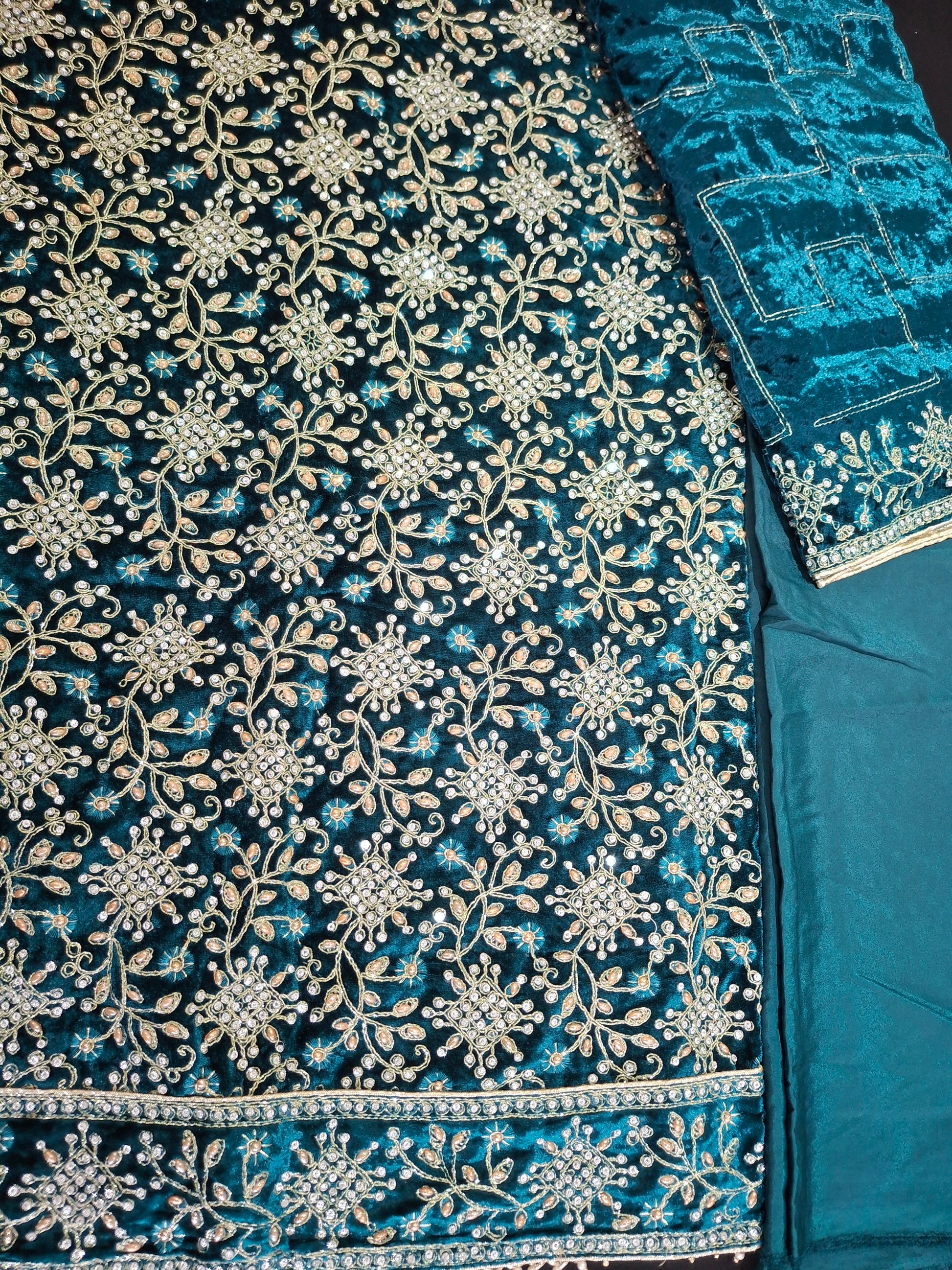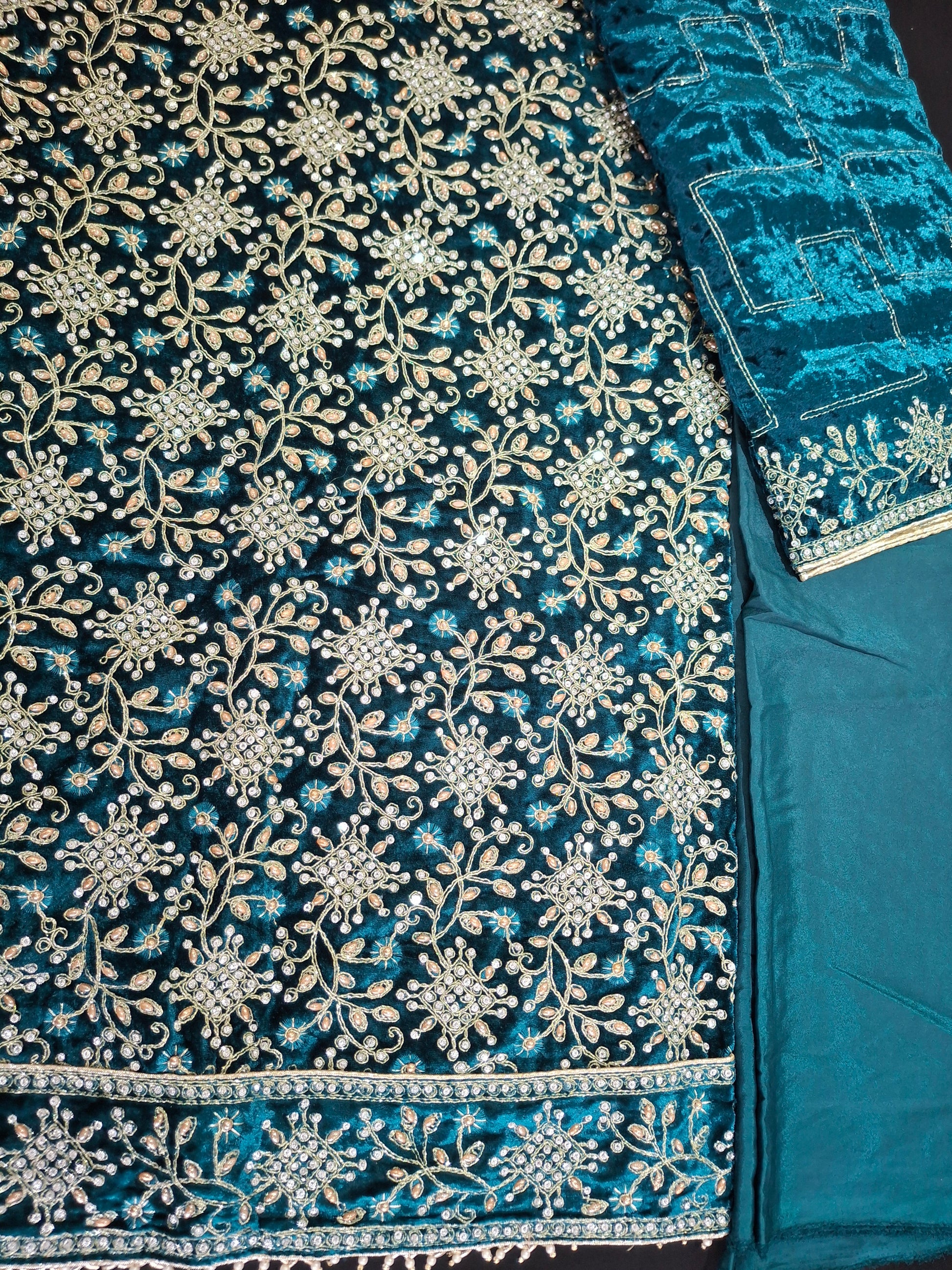 Velvet qameez 2.3meters, dupattas Velvet 2.3meters, trousers plain georgette 2.15meters